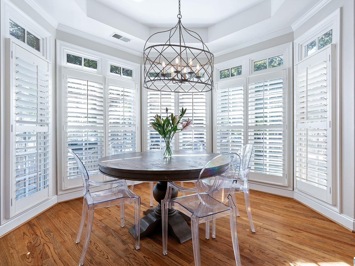 A spacious, sunlit corner of the home designed for casual dining, featuring a round dark wood table at the center with four transparent acrylic chairs. Surrounding the space are large bay windows with crisp white plantation shutters, allowing soft daylight to filter into the room. Pale gray walls and elegant white trim create a fresh, airy atmosphere. Natural wood flooring adds warmth and character, while a geometric wrought iron chandelier hangs above, finishing the look with a touch of modern elegance. A simple vase of fresh tulips sits on the table, adding a delicate natural accent to the serene setting.