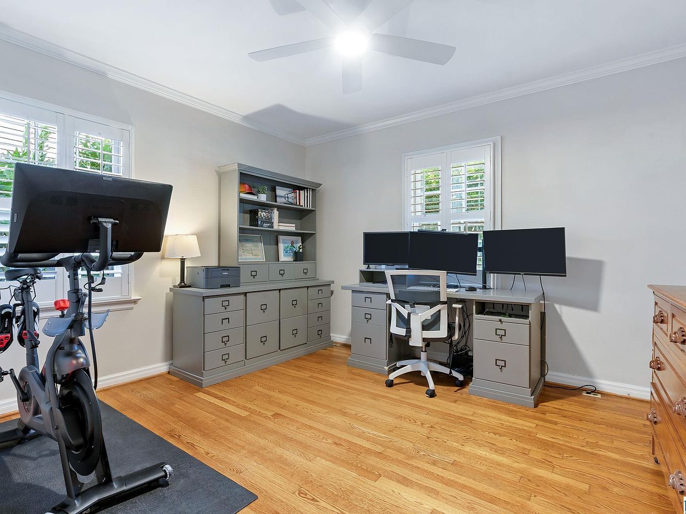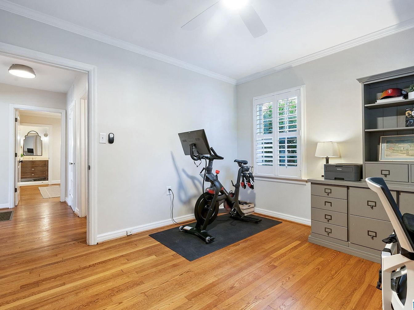 A bright, multi-functional room with light gray walls and white crown molding, featuring honey-toned hardwood floors for a warm, inviting feel. On one side, a stationary exercise bike sits on a rubber mat near a window with white plantation shutters that let in soft natural light. Adjacent is a muted gray built-in unit that combines desk and storage space, topped with a small lamp and printer, as well as decorative items. The space is open and airy, separated from an adjoining hallway and a bathroom with a wooden vanity and arched mirror visible through the doorway, emphasizing both productivity and wellness.