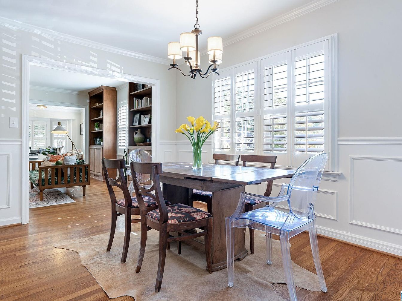 A bright and inviting dining room featuring a rectangular wooden table surrounded by a mix of four classic wooden chairs with floral-patterned seats and one modern transparent acrylic chair at the corner. The room has natural light streaming in from three large windows adorned with white plantation shutters. Walls are painted soft white with elegant wainscoting for added architectural detail. A traditional chandelier with five frosted shades hangs above the table, highlighting a vase of yellow flowers as the centerpiece. The flooring is medium-tone hardwood, partially covered by a light tan cowhide rug, creating a blend of classic and contemporary aesthetics.
