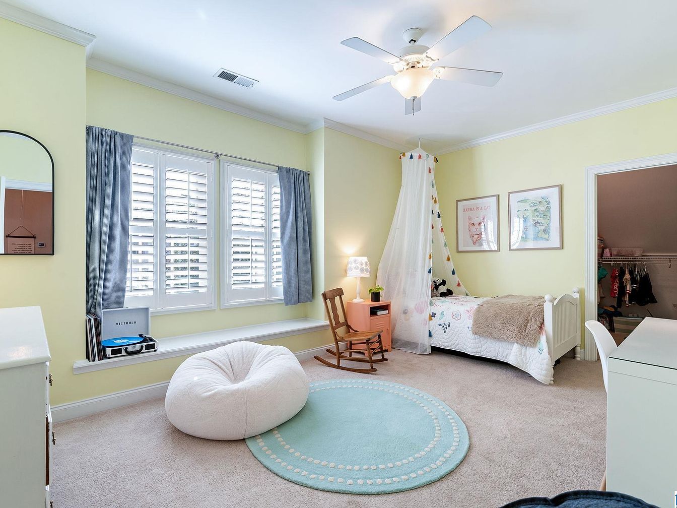 A bright and cheerful children’s bedroom with soft yellow walls and white trim. The room features a single bed covered with a playful quilt, a sheer canopy with colorful pom-poms, and framed artwork above the bed. A cozy reading nook is created by a large bean bag chair on a round blue rug with dotted detailing. There’s a small pink nightstand with a patterned lamp and a wooden rocking chair nearby. Large windows with plantation shutters and blue curtains allow plenty of light to stream in, while a record player sits on the windowsill. A walk-in closet is visible, adding functional storage.