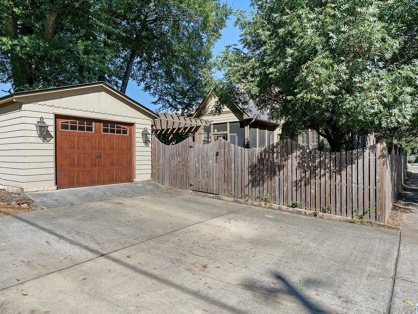 A concrete driveway leads up to a detached garage with a charming wooden door that features decorative window panes at the top. The garage is painted in a neutral taupe color and flanked by two traditional lantern-style wall sconces. To the right of the garage is a tall wooden fence with a gentle scalloped top, providing privacy and enclosing a lush, shaded front yard. Mature trees offer abundant greenery, casting dappled shadows across the area. The architecture is classic and inviting, blending rustic wood accents with the soft, earthy tones of the exterior and natural surroundings.