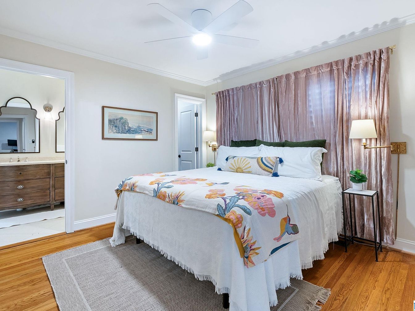 A serene bedroom features a queen-sized bed dressed in a white coverlet and a colorful floral throw, with large green and yellow accent pillows. Behind the bed, mauve velvet curtains extend across the wall, softly diffusing light from the window. The walls are painted a gentle cream, complemented by crown molding and honey-toned hardwood floors. A simple, light rug lies below the bed. On one side, a minimalist metal side table holds a potted plant, and a wall-mounted sconce provides ambient lighting. An open doorway leads to a bathroom with a rustic wooden vanity and scalloped mirror, enhancing the cozy, elegant ambiance.