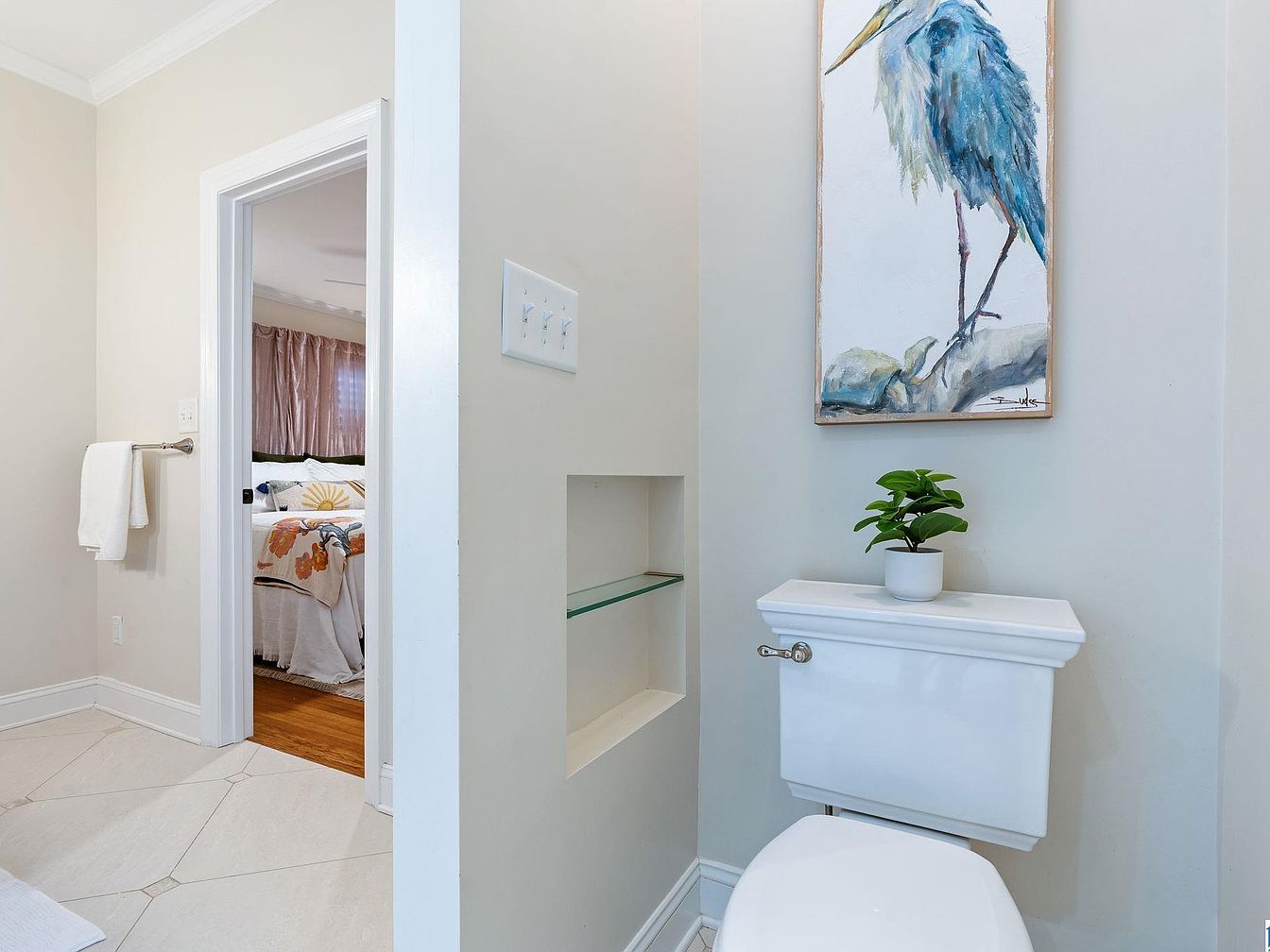 A compact, bright bathroom area with off-white walls and white trim, featuring a modern toilet topped with a small potted plant for a touch of greenery. Above the toilet, a framed painting of a blue heron adds an artistic focal point. Built into the wall, a niche with glass shelving offers subtle display space. Large, pale floor tiles give the room an airy and pristine feel. Through the doorway, a glimpse of the adjacent bedroom reveals soft peach drapes and bedding with large, cheerful floral patterns, introducing warmth and color that contrast gently with the minimalist bathroom palette.