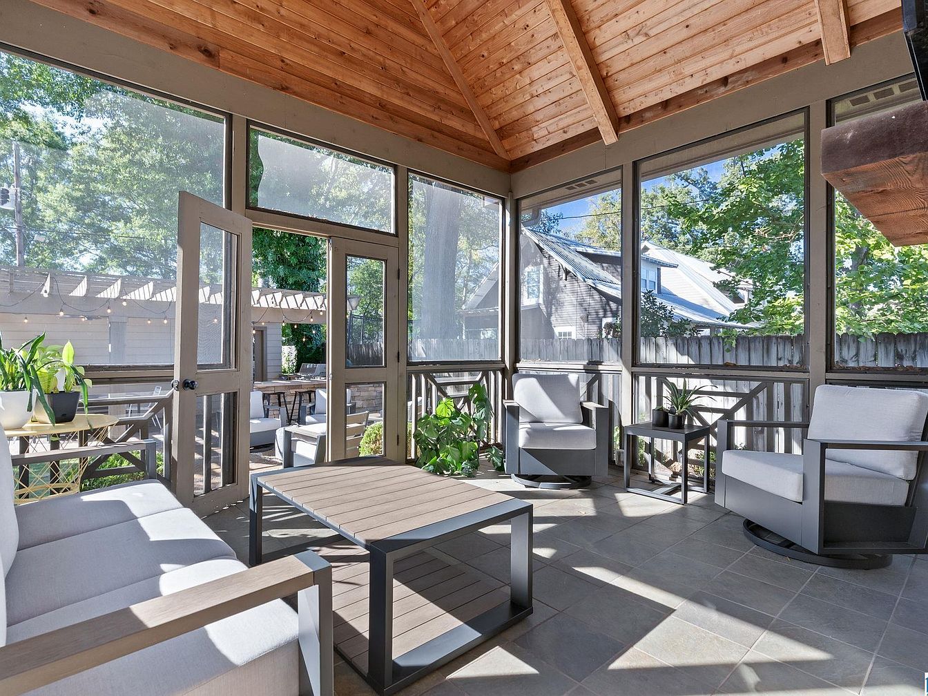 Spacious screened porch featuring a vaulted wooden ceiling with exposed beams and large mesh windows that allow in ample natural light. The seating arrangement includes contemporary gray cushioned chairs and a matching sofa, all with sleek, clean lines and metal frames. A rectangular coffee table and a small side table offer utility, while potted plants on surfaces and in corners add a touch of greenery. Cool-toned tile floors contrast with the warm wood tones above, creating a balanced, inviting atmosphere perfect for relaxing. Outdoor views and a visible pergola enhance the connection between the porch and garden.