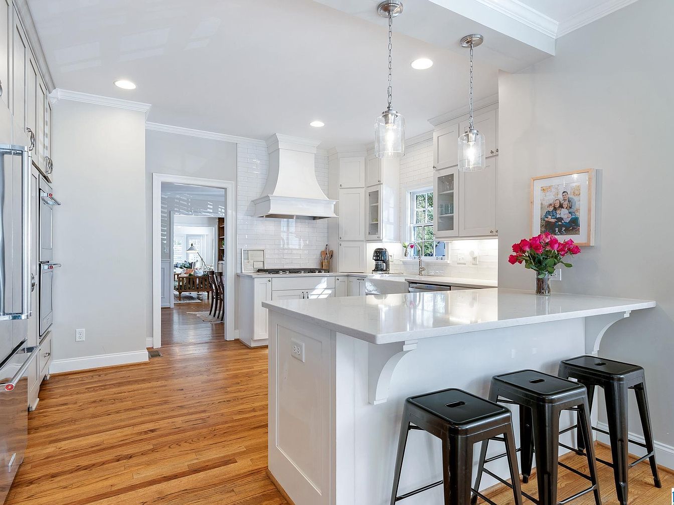 A bright, airy kitchen features a large white island with a smooth countertop and three sleek black metal stools tucked underneath. The cabinetry is painted soft white, complementing glossy white subway tile backsplash and a dramatic range hood. Pendant lights with clear glass shades hang above the island, casting a gentle glow. Blonde hardwood floors add warmth beneath. On the island, a glass vase holds fresh pink flowers, and a framed family photo decorates the wall nearby. The adjacent kitchen and dining area are visible through a doorway, seamlessly connecting the spaces in a welcoming, open layout.