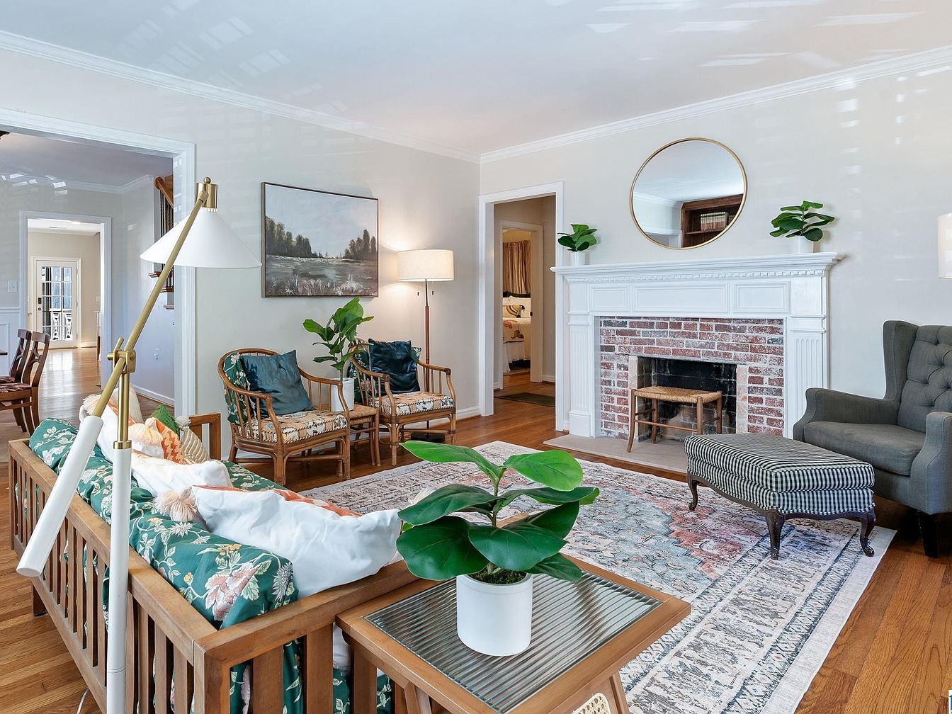 A spacious living room with hardwood floors features a central white brick fireplace topped with a round mirror and flanked by potted greenery. Neutral walls brighten the space, complemented by warm wood furniture and a vintage-style rug with blue and burgundy accents. A mid-century styled sofa with floral upholstery sits in the foreground, paired with a modern brass-accented floor lamp. Two rattan chairs with patterned cushions are arranged next to a leafy potted plant. An upholstered armchair and striped ottoman add comfort near the fireplace, while serene wall art and abundant natural light contribute to a warm, inviting atmosphere.