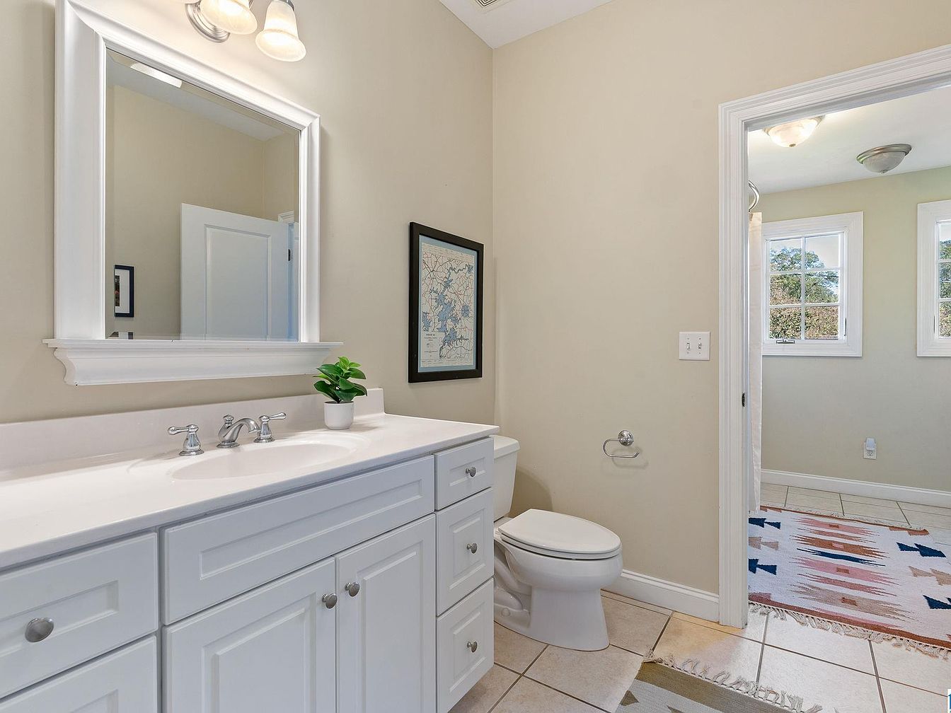 Neutral-toned bathroom with a classic white vanity topped by a wide, matching countertop and integrated sink. Above the sink is a large, white-framed mirror, flanked by dual light sconces with frosted glass shades that provide gentle illumination. A small green potted plant adds a fresh, natural accent on the vanity. Beige walls lend warmth, complemented by off-white floor tiles arranged in a grid pattern. The toilet is situated beside the vanity under a simple toilet paper holder, with a framed map artwork hanging above. Beyond the open doorway, a woven rug with a geometric pattern adds color to the adjacent room, which features tall white-trimmed windows.