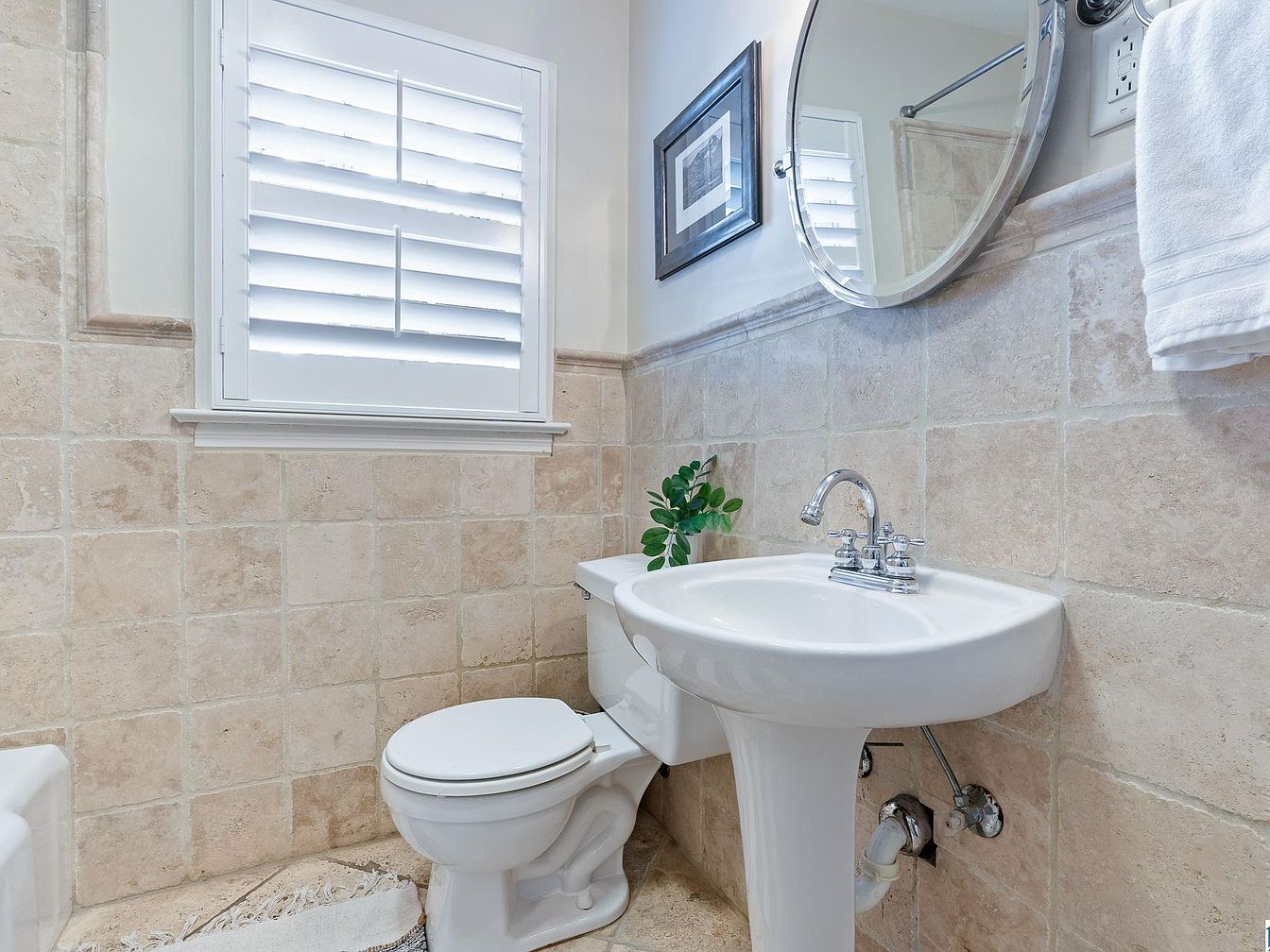 Compact corner bathroom featuring a pedestal sink and a standard white toilet. Walls are clad in neutral, beige square tiles that reach up to a crisp white wainscoting edge. The window has white plantation shutters allowing gentle light to filter through, brightening the space. Above the sink, a large round mirror with a shiny metal frame adds depth and light. A simple framed black and white photograph hangs nearby. The towel rack holds a neatly folded white towel, and a leafy green accent plant adds a touch of freshness to the countertop. Surfaces and fixtures are immaculate, reinforcing a clean, orderly aesthetic.