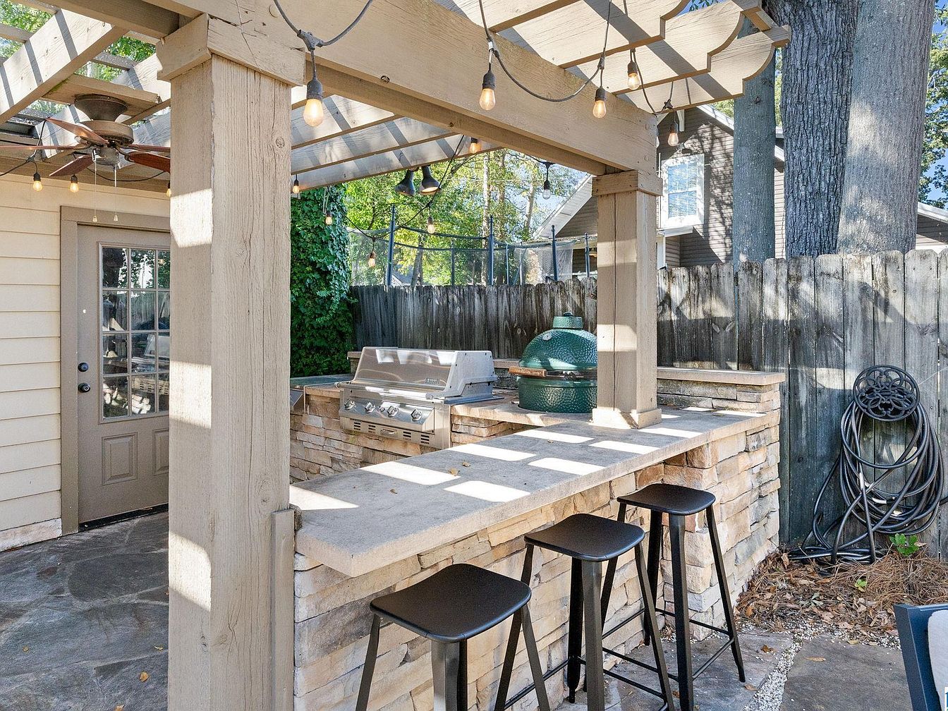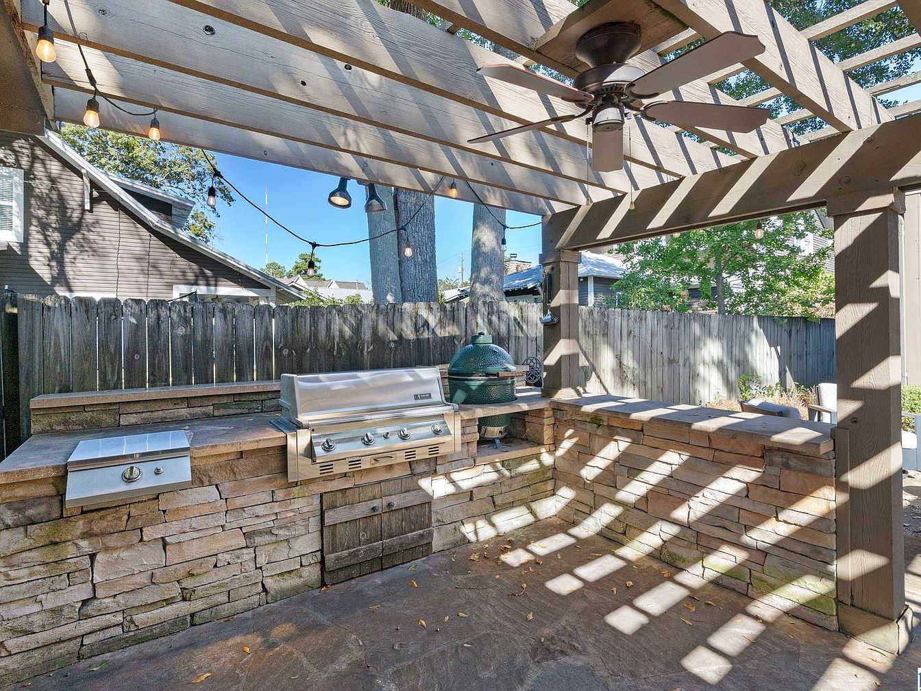 A spacious, inviting outdoor kitchen is framed by a wooden pergola with bold beams casting angular shadows on the stone countertop and floor below. The kitchen features a built-in stainless steel gas grill, a green ceramic smoker, and a side burner, all set within stacked stone cabinetry. Overhead, string lights contribute warm ambiance alongside a ceiling fan with wooden blades for comfort. A tall wooden fence encloses the space, offering privacy while mature trees and surrounding homes add to the relaxed suburban atmosphere. The natural stone textures and wood blend seamlessly, creating a rustic yet modern outdoor entertaining area.