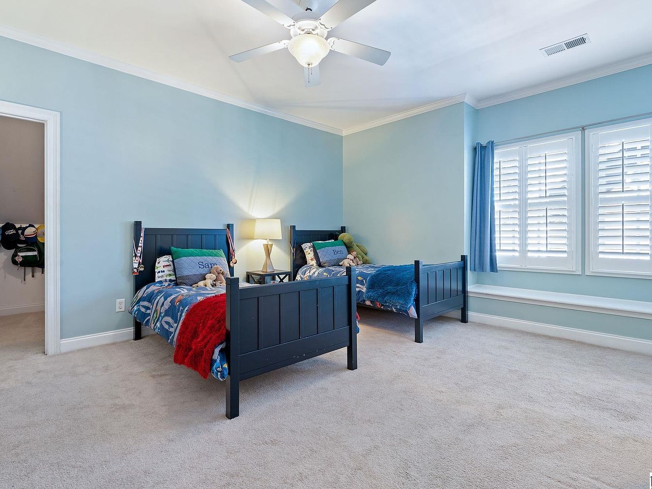 A spacious children’s bedroom painted in soft sky blue with plush, light beige carpeting, and generous natural light from two shuttered windows. The room features two matching navy blue twin beds with playful bedding, adorned with stuffed animals and accent pillows. A modern nightstand sits between the beds, topped with a lamp providing a warm, cozy glow. A ceiling fan with a white base hangs in the center, enhancing comfort. The trim and moldings are bright white, giving the room a crisp, clean finish. Off to the side, an open doorway reveals an organized closet with hung hats and bags.