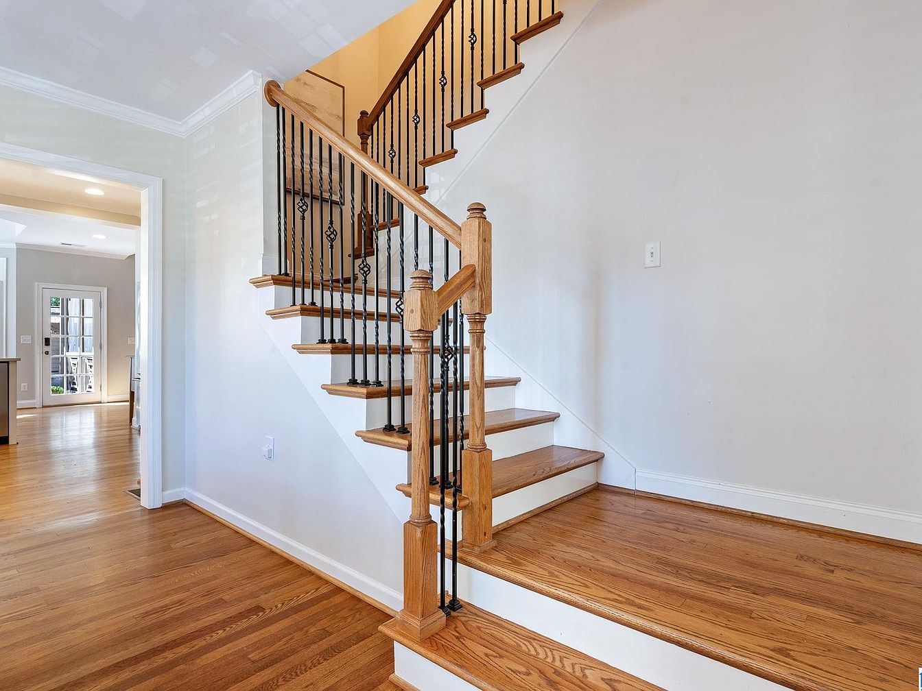 The entryway centers on a wooden staircase with rich, medium-toned hardwood treads and a matching handrail. The balusters are crafted from black wrought iron, featuring ornamental diamond details that add a subtle decorative flair. Smooth white risers create a clean contrast with the wood. The floors throughout the space are polished hardwood in a natural honey shade, contributing warmth. Walls are painted a pale, neutral gray, brightening the area and complementing the crisp white trim and crown molding. Ample natural light streams in from adjacent rooms, giving the space an open and welcoming feel. Architectural lines are simple and classic.