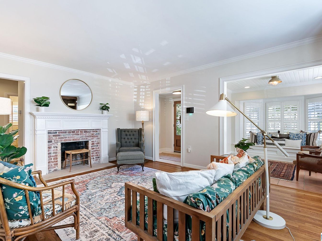 A bright and airy living room with a cozy ambiance. The space features a classic white fireplace with red brick inlay and a round gold-framed mirror above. A tufted, high-back gray armchair sits nearby with a striped ottoman. The central area contains a patterned area rug in muted blues and corals, with a wooden-framed sofa dressed in botanical print cushions and white accent pillows. Large leafy houseplants add freshness. Walls are painted a soft cream, complemented by warm wood flooring. The adjoining room features a windowed nook with white plantation shutters, window seating, and coordinated blue and neutral cushions.