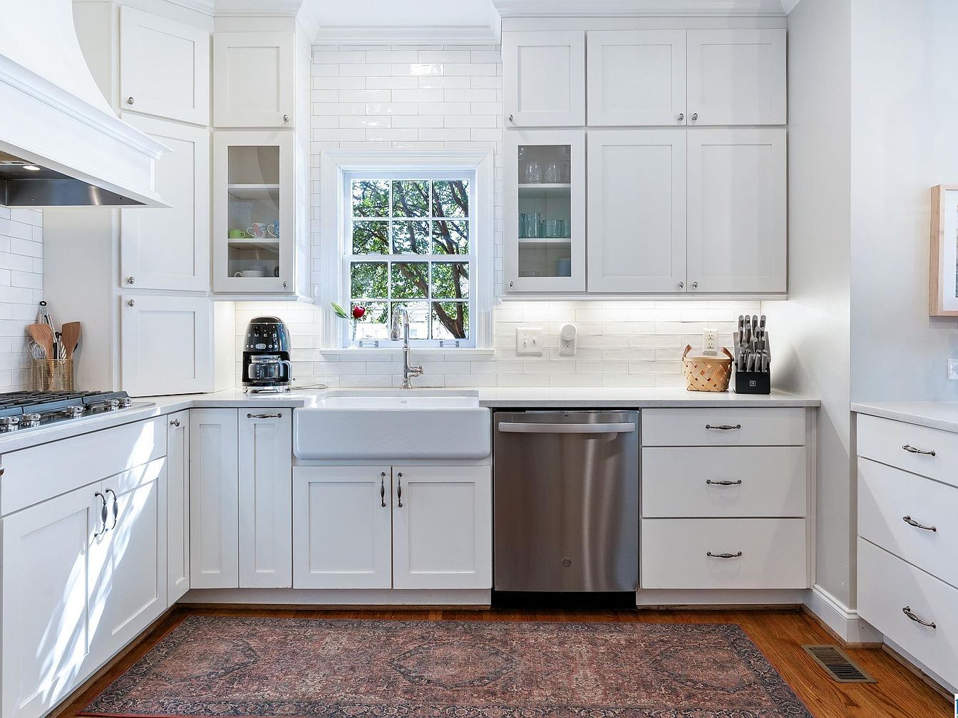Bright natural light streams through a multi-pane window above a white farmhouse sink, highlighting the clean, crisp aesthetic of this kitchen. Shaker-style white cabinetry lines the walls, providing ample storage, with a mix of solid and glass-fronted doors that showcase coffee mugs and dishes. Polished subway tile backsplash and marble countertops contribute to the fresh, timeless look. Stainless steel appliances, including a dishwasher and gas cooktop, add a modern touch. A classic rug in muted red tones covers the rich hardwood floor, adding warmth and texture to the predominantly white, uncluttered space. Small appliances and utensils sit neatly on the counters, completing the functional yet inviting feel.