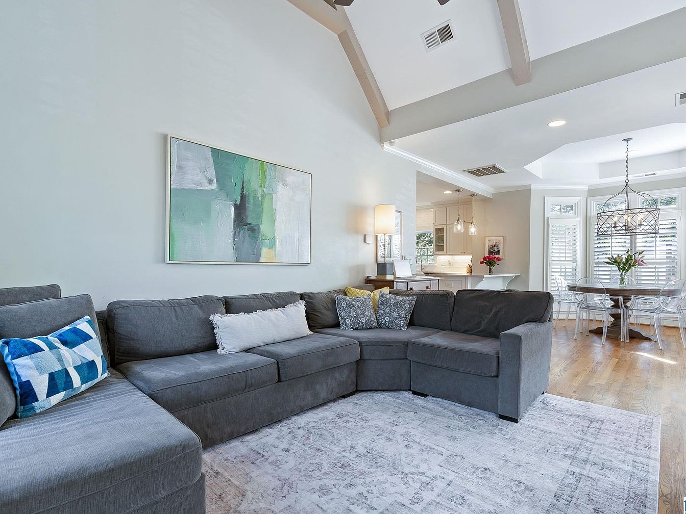 Spacious living area with high, exposed beam ceilings, painted in a soft, neutral color that opens up the space. A large, dark gray sectional sofa with a mix of patterned and textured throw pillows dominates the seating area. Above the sofa hangs a contemporary abstract painting in shades of green and gray, adding a touch of color. The room transitions seamlessly into a dining nook and a bright, open kitchen with white cabinetry and pendant lighting. Warm wood flooring extends throughout, complemented by a muted, patterned area rug. Natural light floods in through plantation shuttered windows, creating a welcoming, airy ambiance.