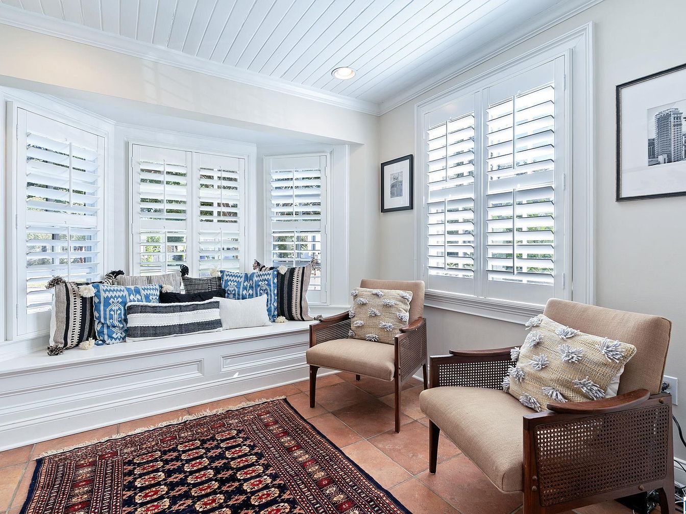 A bright sunroom features floor-to-ceiling bay windows lined with crisp white plantation shutters, flooding the space with natural light. A built-in window bench spans the corner, trimmed in elegant panel molding and covered in an assortment of blue, white, and black patterned throw pillows with varied textures. Two mid-century style wooden chairs with woven cane sides flank the right side, each with a neutral cushion and a textured pillow adorned with white pom-poms. The terracotta tiled floor warms the room, anchored by a richly patterned oriental rug. Soft white walls and a light blue, beadboard ceiling give the space a fresh yet cozy feel.