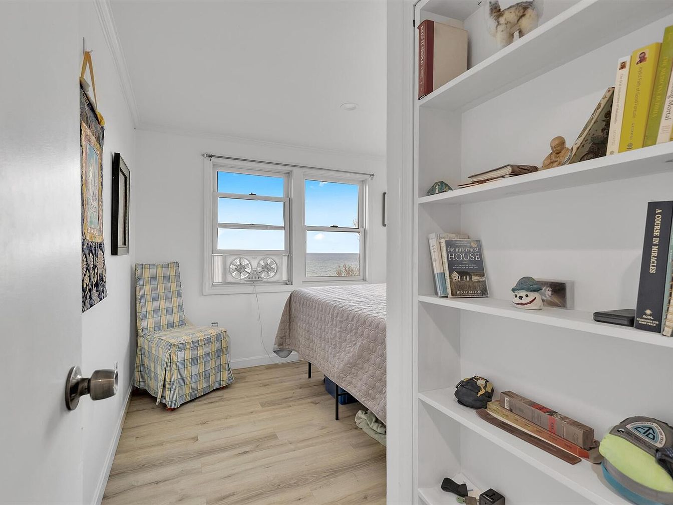 A cozy bedroom alcove features soft, white walls and a bright, airy ambiance enhanced by natural light flooding through the large windows. A neatly made bed with a textured quilt occupies one side, complemented by a light blue bed frame. Adjacent, a checked fabric chair in pastel yellow and blue invites relaxation. A white built-in bookshelf displays a curated selection of books and decorative items, lending personality to the space. The wooden flooring adds warmth, while the combination of color and texture creates a calming retreat. Subtle artwork on the walls offers a touch of character and interest.