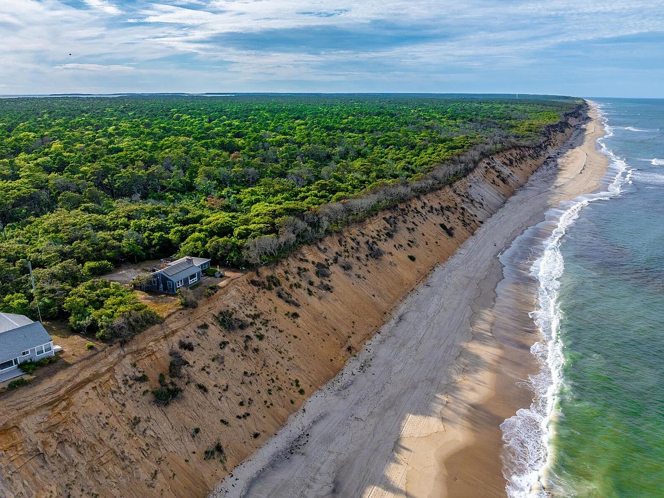 An aerial view captures a serene coastal landscape where lush greenery meets sandy shores. On the left, a modest house with large windows blends harmoniously with nature, suggesting a cozy retreat. The forested area extends into the distance, rich in varying shades of green. The sandy cliff edge drops steeply to the beach, revealing a gentle wave pattern along the shoreline. Soft waves lap against the sand, creating a calming atmosphere. The sky is lightly clouded, allowing rays of sunlight to filter through, illuminating the scene and enhancing the tranquil, natural beauty of this seaside setting.