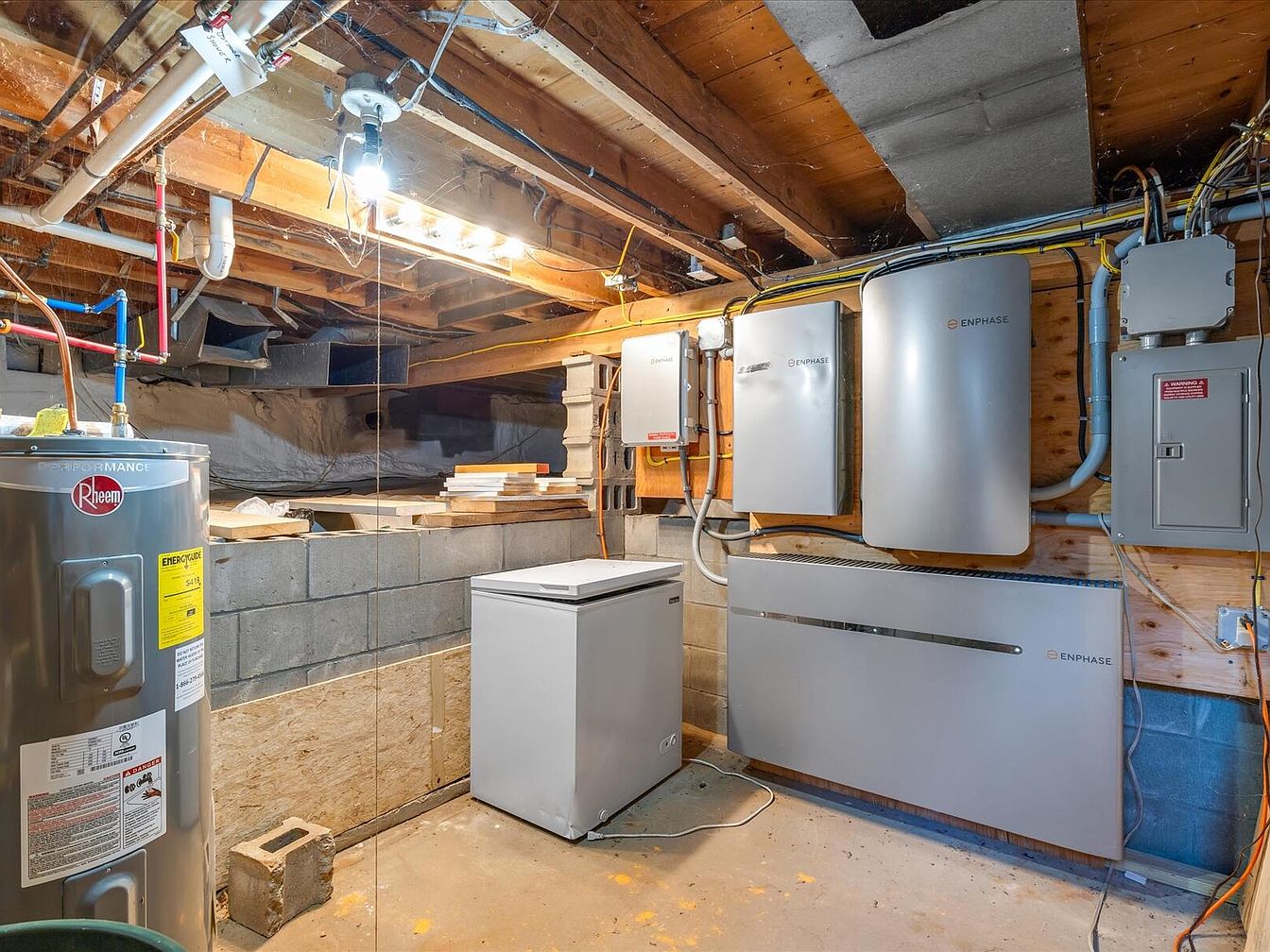 A practical basement utility space featuring exposed wooden beams overhead and a combination of various appliances. The walls are primarily made of cinder blocks with a clean, functional design. A Rheem water heater stands prominently, along with a chest freezer and electrical panels mounted on the wooden wall, indicating their utility purpose. Several colored wires are connected, showcasing modern installation. The floor is cement, enhancing the industrial feel, while a warm yellow light from overhead fixtures brightens the room, creating a usable environment. Shelving and construction materials hint at ongoing home projects.