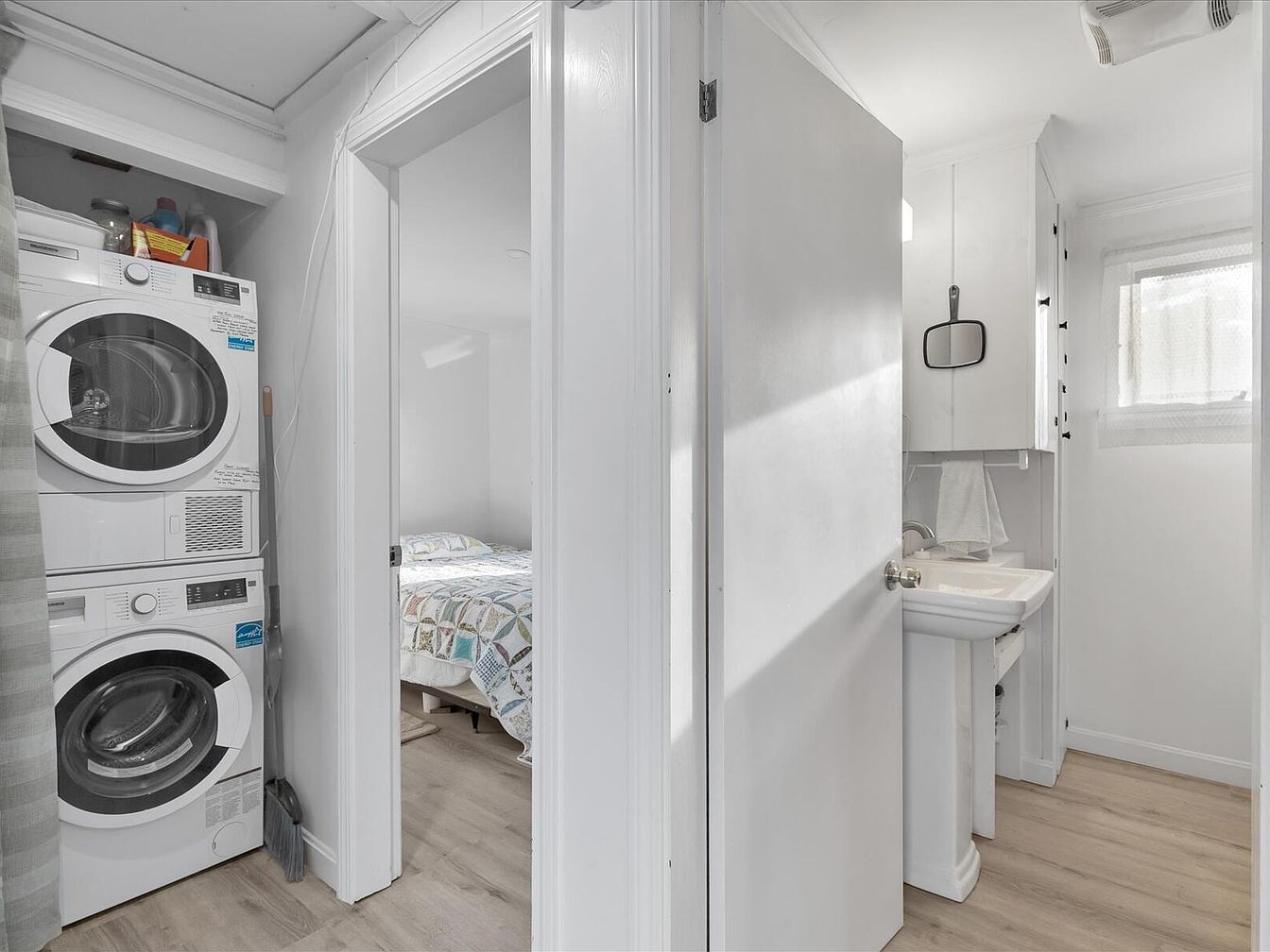 This space features a compact laundry area designed for efficiency. The stacked washer and dryer occupy one side, elegantly encased by a light gray curtain that maintains a clean look. The adjacent room is partially visible, revealing a bed with a colorful patchwork quilt. White walls and light wooden flooring create a bright, airy atmosphere. Simple cabinetry above the sink maximizes storage while maintaining a minimalist aesthetic. A small mirror hangs on the wall next to the sink, alongside a window that allows soft natural light to filter in, enhancing the cozy feel of this functional area.