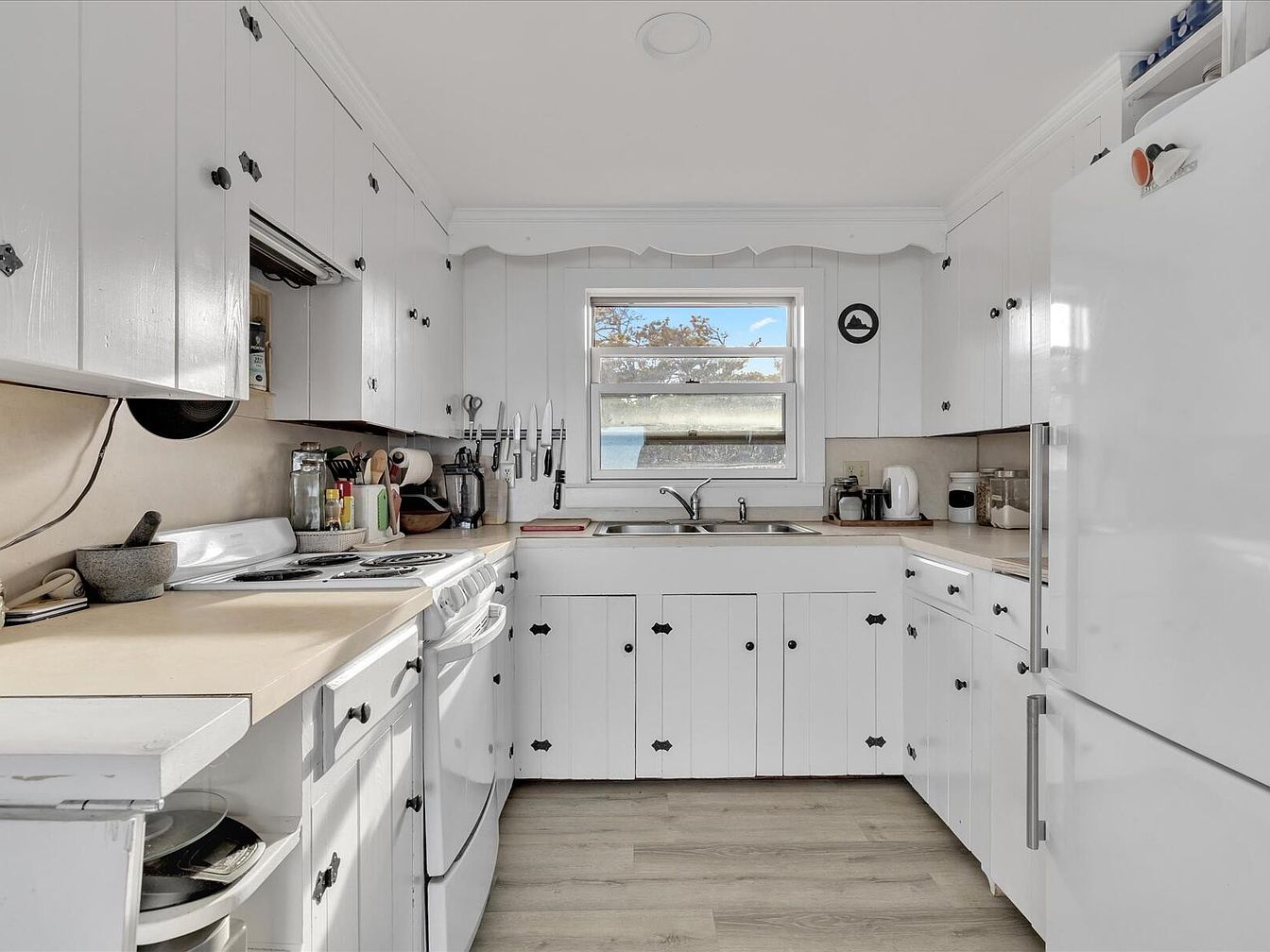 This quaint kitchen features a primarily white color scheme, with painted wood cabinetry and a neutral countertop. The layout is compact but functional, showcasing a mix of modern appliances and rustic charm. Cabinets lined with simple black knobs create a striking contrast against the white wood. Basic appliances, including a stove and refrigerator, sit seamlessly within the cabinetry. A double sink is positioned beneath a window, allowing natural light to illuminate the space. Subtle decor elements such as knife racks and kitchenware create a lived-in, practical ambiance, enhancing the room’s inviting and homey feel.