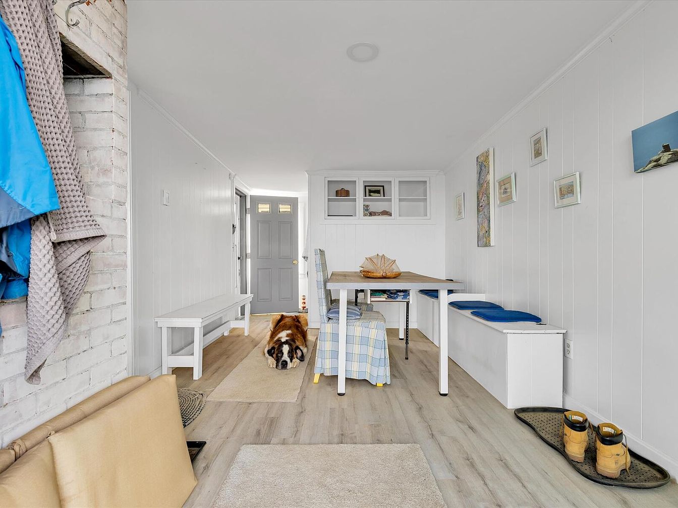 This entryway showcases a bright and welcoming atmosphere. The walls are painted in a crisp white, complemented by light wood flooring that enhances the airy feel. A bench with a cozy fabric covers one side, while a small table sits centrally beneath a simple light fixture. Built-in cubbies display personal items and art, adding character. Various framed pictures adorn the walls, providing a touch of personalization. On the floor, a runner extends towards the front door, leading past a well-placed dog lounging comfortably. Functional elements like a boot tray and hooks for coats add practicality to the design.