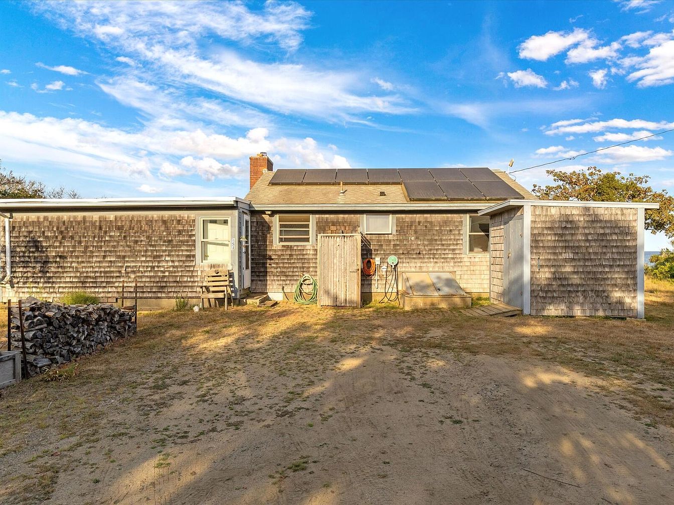 This image showcases a rustic exterior of a historic American home, characterized by weathered wood shingles on the main structure and an adjoining smaller section. The home features a light-toned entrance door, contrasting with the darker tones of the shingles. A sloping roof holds solar panels, highlighting modern sustainability within a traditional aesthetic. The landscape is open, with dry grass and light dirt paths leading to the coastline, enhancing the property’s coastal charm. In the background, vibrant blue skies and scattered clouds frame the scene, while a couple of trees add a touch of greenery, enhancing the tranquil atmosphere.