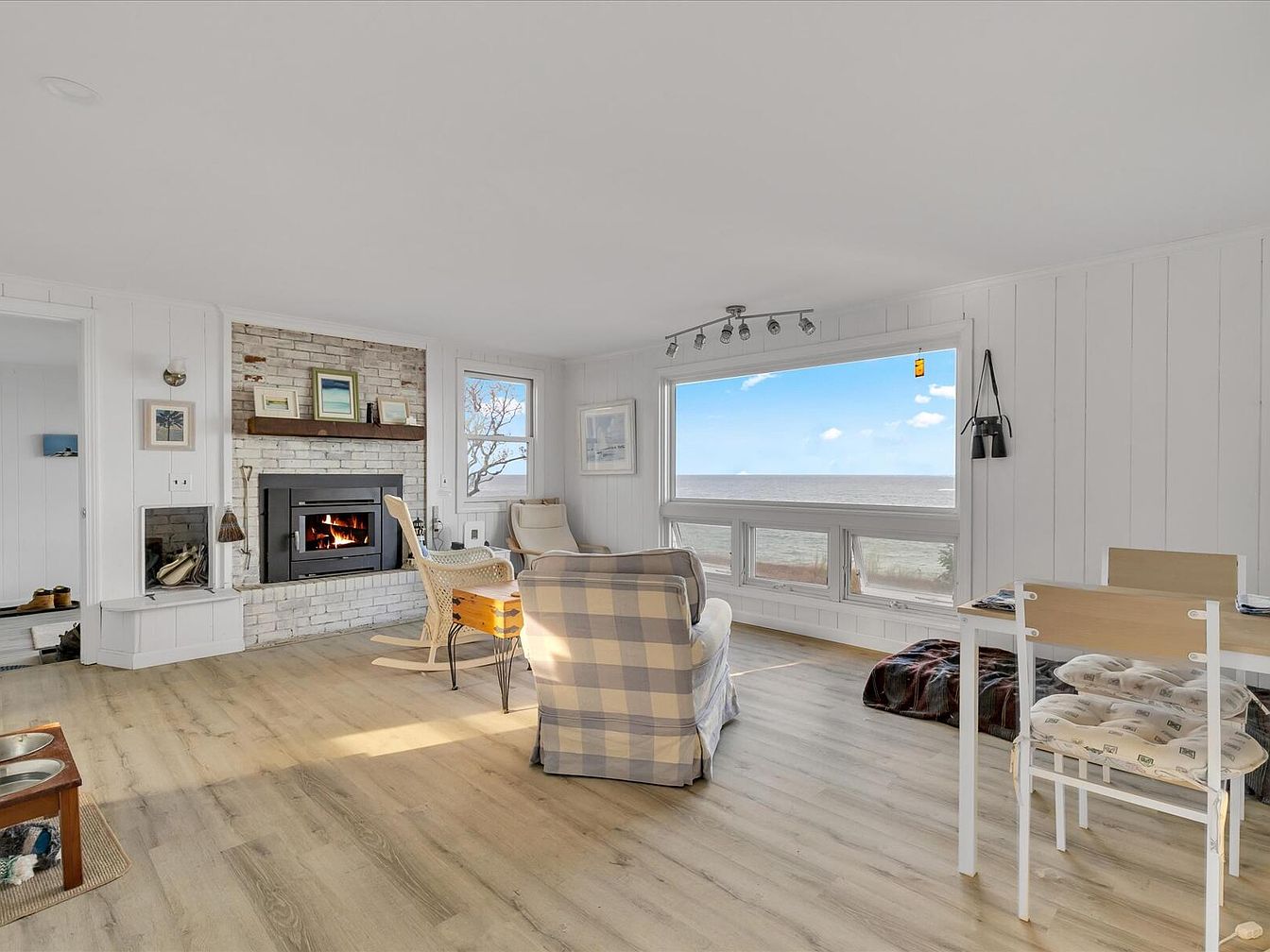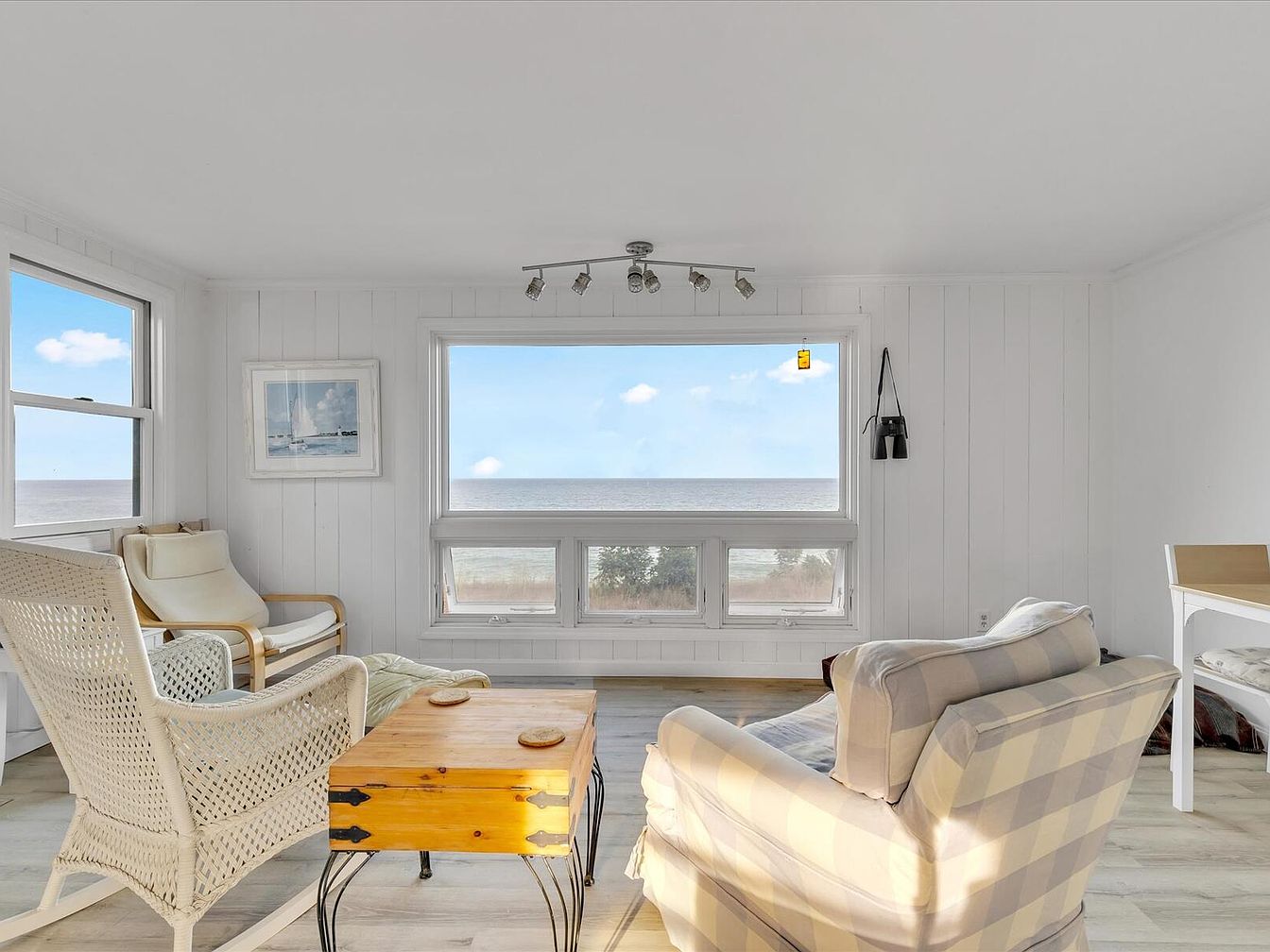 A cozy sunroom highlights large windows that invite abundant natural light and views of the serene water outside. The walls are clad in white shiplap, enhancing a clean coastal vibe. A comfortable rocking chair in a soft cream hue and a plush, checkered sofa create a relaxed seating area. A rustic wooden coffee table adds warmth and contrast, complemented by round coasters. The minimalist decor is accentuated by a lone nautical-themed artwork on the wall. Subtle track lighting offers soft illumination, making this space ideal for leisurely afternoons or quiet evenings enjoying the tranquil surroundings.