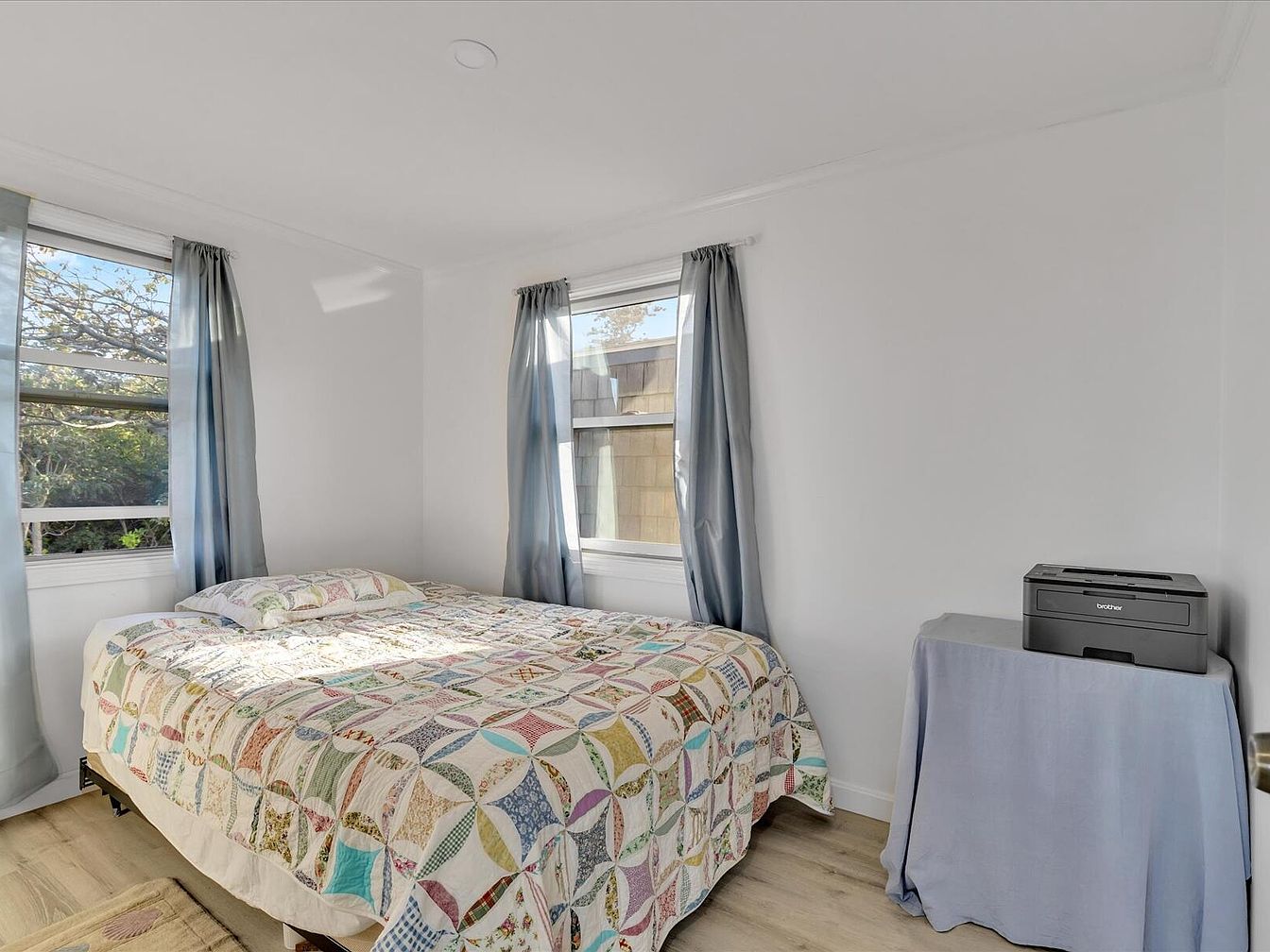 This bedroom features a cozy layout with an inviting ambiance. A queen-sized bed adorned with a colorful quilt takes center stage, showcasing an array of patchwork patterns. Light blue curtains drape elegantly from the window frames, allowing natural light to filter in. The walls are painted a bright white, enhancing the room’s airy feel. A subtle wooden floor adds warmth to the space. In the corner, a small table covered with a light blue cloth holds a printer, emphasizing functionality. The large windows provide a view of greenery outside, creating a tranquil and serene environment.