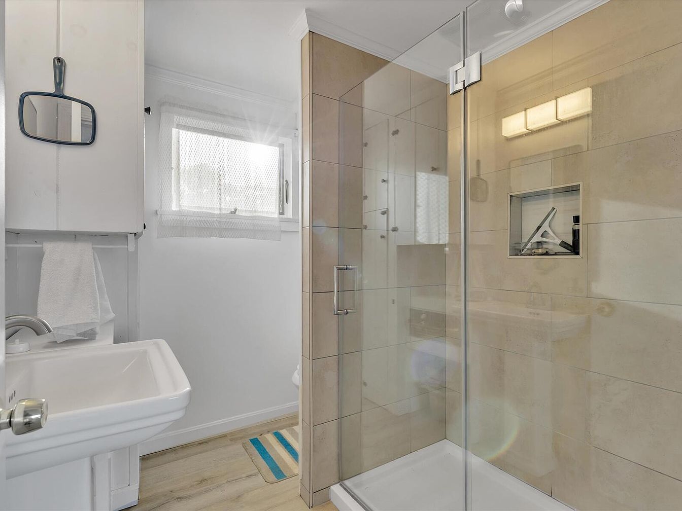 This modern bathroom features a sleek design with an open shower area enclosed by glass panels, allowing for a spacious feel. The walls are adorned with light-colored tiles, reflecting a soft ambiance. A minimalist vanity with a simple sink is complemented by a modern faucet and a mirror mounted on a white cabinet. Natural light floods the space through a small window, enhancing the bright, airy atmosphere. The floor showcases wood-like tiles, adding warmth to the otherwise cool color scheme. A striped bath mat introduces subtle color, contributing to the contemporary yet inviting aesthetic.