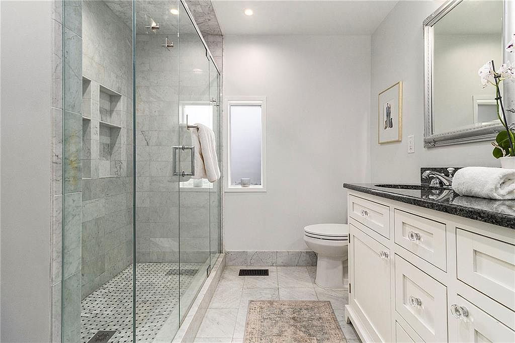 A spacious bathroom features a large glass-enclosed shower with marble tile and built-in shelves for storage. The room is finished in soft gray and white tones, complemented by a large white vanity with multiple drawers, elegant silver hardware, and a dark stone countertop. A neatly rolled towel and a vase with orchids provide a touch of luxury atop the vanity. Soft lighting from recessed ceiling lights and a wide wall mirror enhance the space’s brightness. The floor is tiled in polished marble, with a light area rug adding warmth near the vanity. A frosted window offers privacy and natural light.