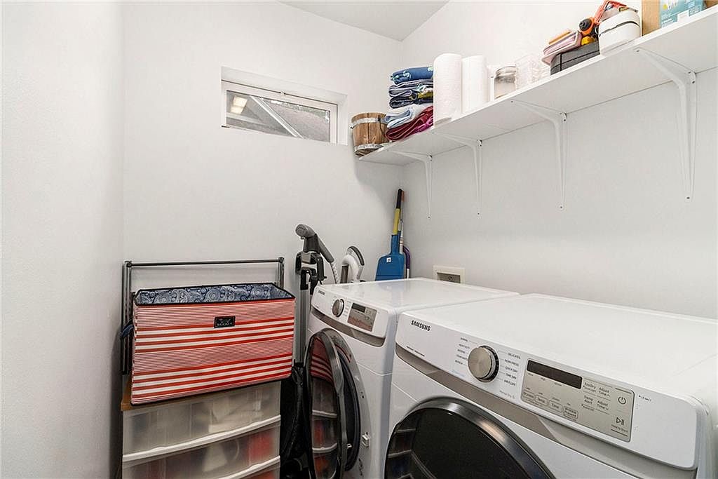 A cozy, functional laundry room with white walls and a minimalist design. Front-loading washer and dryer units in white sit side by side along the right wall. Above them, a single white floating shelf holds neatly folded towels, paper towels, and various household items. A small window provides natural light, adding brightness to the otherwise compact space. Cleaning tools and supplies are organized in the corner beside the machines. Opposite the appliances, a set of plastic storage drawers topped with a red striped fabric basket adds additional organization. The overall feel is practical and uncluttered, with a focus on utility.