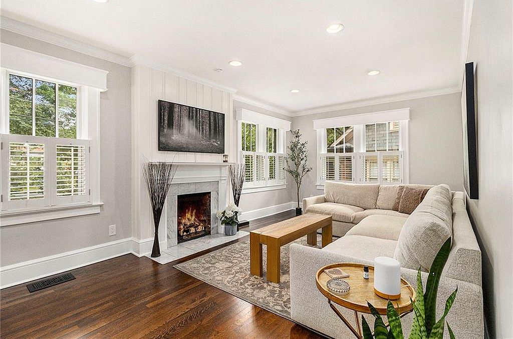 A spacious living room filled with natural light from three large windows featuring white wood trim and classic shutters. Soft grey walls and white crown molding create a calm and elegant atmosphere. A white marble fireplace serves as a focal point, topped with monochromatic art and flanked by tall decorative vases. The L-shaped beige sectional sofa sits atop a muted patterned area rug, complemented by a simple wooden coffee table. A round wooden accent table displays small décor items and a potted snake plant. Recessed ceiling lights and a potted indoor tree add to the room’s fresh, contemporary feel.