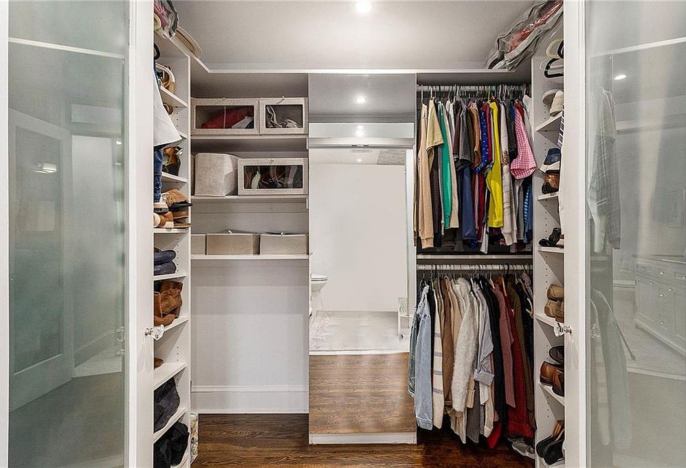 A spacious walk-in closet features built-in shelving along both walls, neatly organizing shoes, hats, and folded items. Centrally, two racks hold an assortment of men’s and women’s clothing, including shirts, jackets, and pants in a range of colors. Soft ceiling lights create an inviting atmosphere. The color palette is neutral, with white shelving, light gray walls, and a warm, rich wood floor. Frosted glass doors partially frame the closet, adding modern elegance. Storage bins on the shelves help keep the space tidy and functional, blending style and practicality in this organized dressing area.