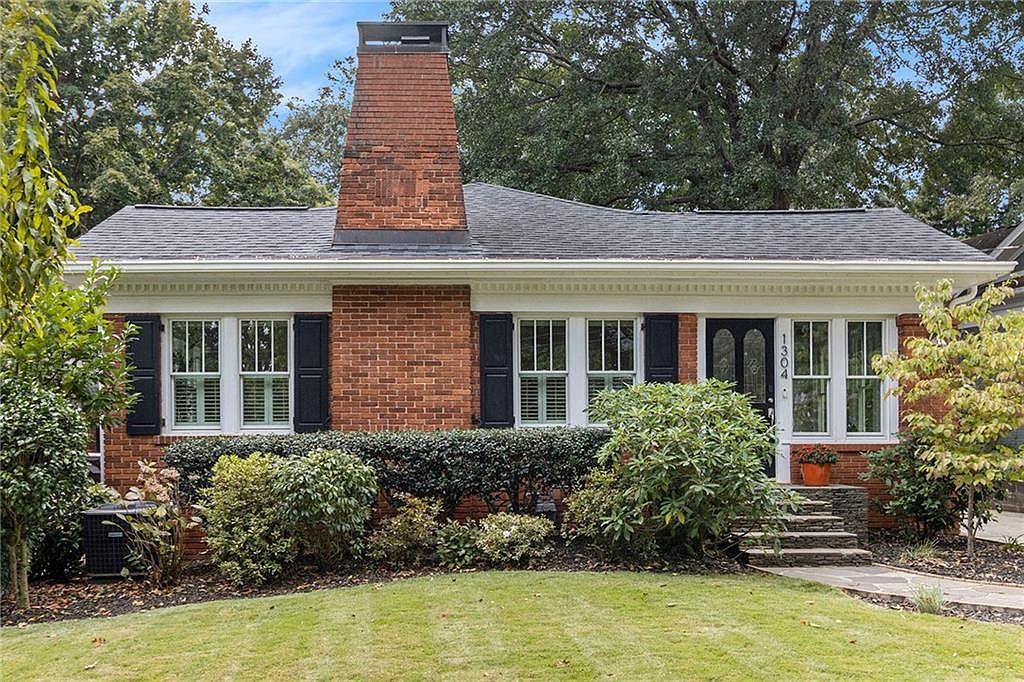 A single-story historic brick house stands prominently with a centered brick chimney and symmetrical design. The roof is dark gray and features deep eaves with decorative white trim. Windows line the front, each with white frames and black shutters, giving a classic American bungalow feel. Well-manicured hedges and landscaped bushes border the front façade, softening the strong lines of the brickwork. A short set of steps leads to the black front door, while mature trees and lush green lawn add charm and shade to the front yard, creating an inviting, timeless curb appeal in a tranquil residential neighborhood.