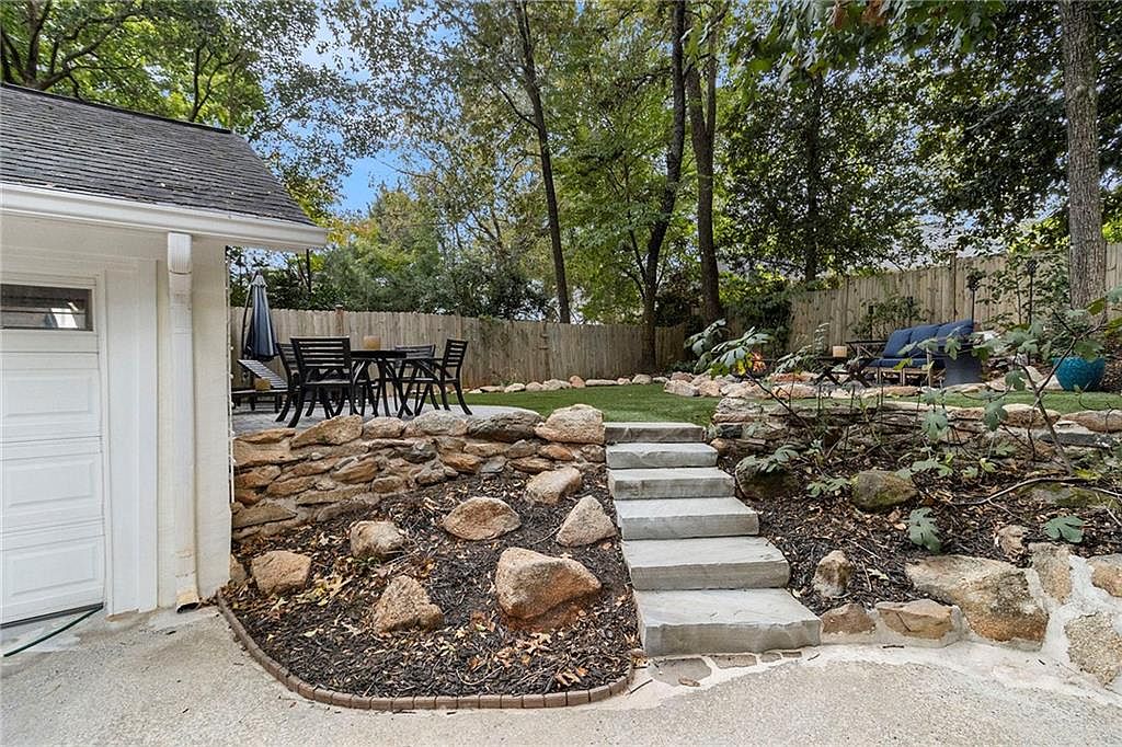 Multi-level backyard space features stone steps leading to a terraced area bordered by natural rock walls. The lower level has a concrete surface, while the upper level offers two distinct zones: an outdoor dining area with a black table, matching chairs, and a closed umbrella, as well as a cozy seating nook with a blue outdoor loveseat and small coffee table. The space is surrounded by lush greenery, mature trees, and a wooden privacy fence, creating a serene and shaded retreat. The overall color palette combines natural earthy tones with pops of dark furniture, blending harmoniously with the environment.