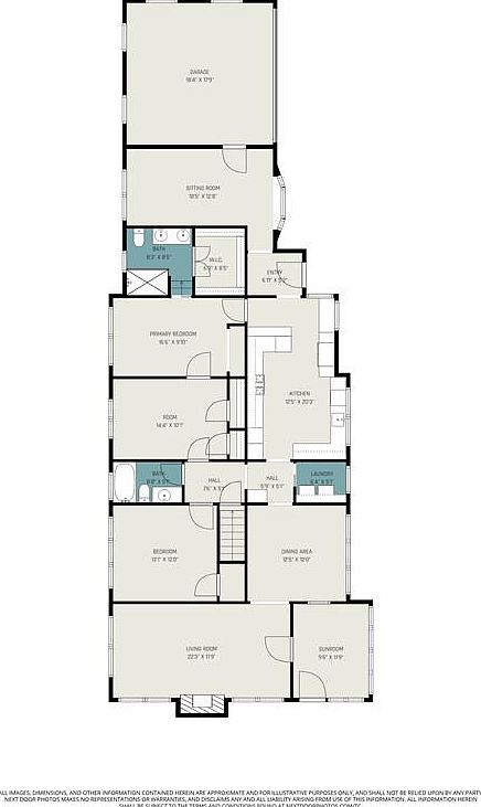 A detailed floor plan layout of a single-story historic American home reveals a spacious and logical flow between rooms. At the bottom, the main entrance opens to a wide living room, flanked by a sunroom to the right. Adjacent to the living room, a large dining area leads into a long hallway connecting the primary and secondary bedrooms, a hall bath, and a spacious kitchen. The kitchen features direct access to a laundry room and a small deck. To the rear, a sitting room and second bath sit beside a sizable garage, providing practical access and utility. High ceilings, generous room sizes, and a rectangular footprint suggest classic, functional architecture.