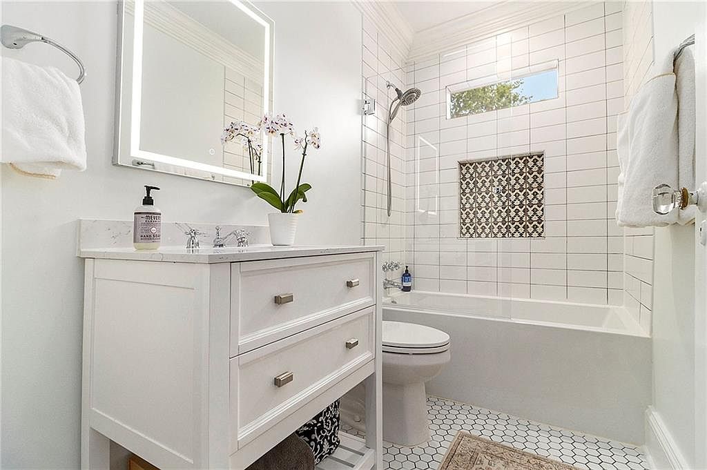 A bright, fresh bathroom featuring white hexagonal floor tiles and glossy subway tile walls around a combined bathtub and shower. The shower has a brushed chrome showerhead and two built-in niches, one with intricate black and white patterned tiles. A modern vanity with a marble countertop and shaker drawers sits to the left, topped with a potted orchid and liquid soap. An illuminated square mirror hangs above the vanity. White towels are neatly placed on chrome rings and bars, while a neutral-patterned rug softens the space. The color palette is crisp white with subtle grey and beige accents, creating a clean, airy ambiance.