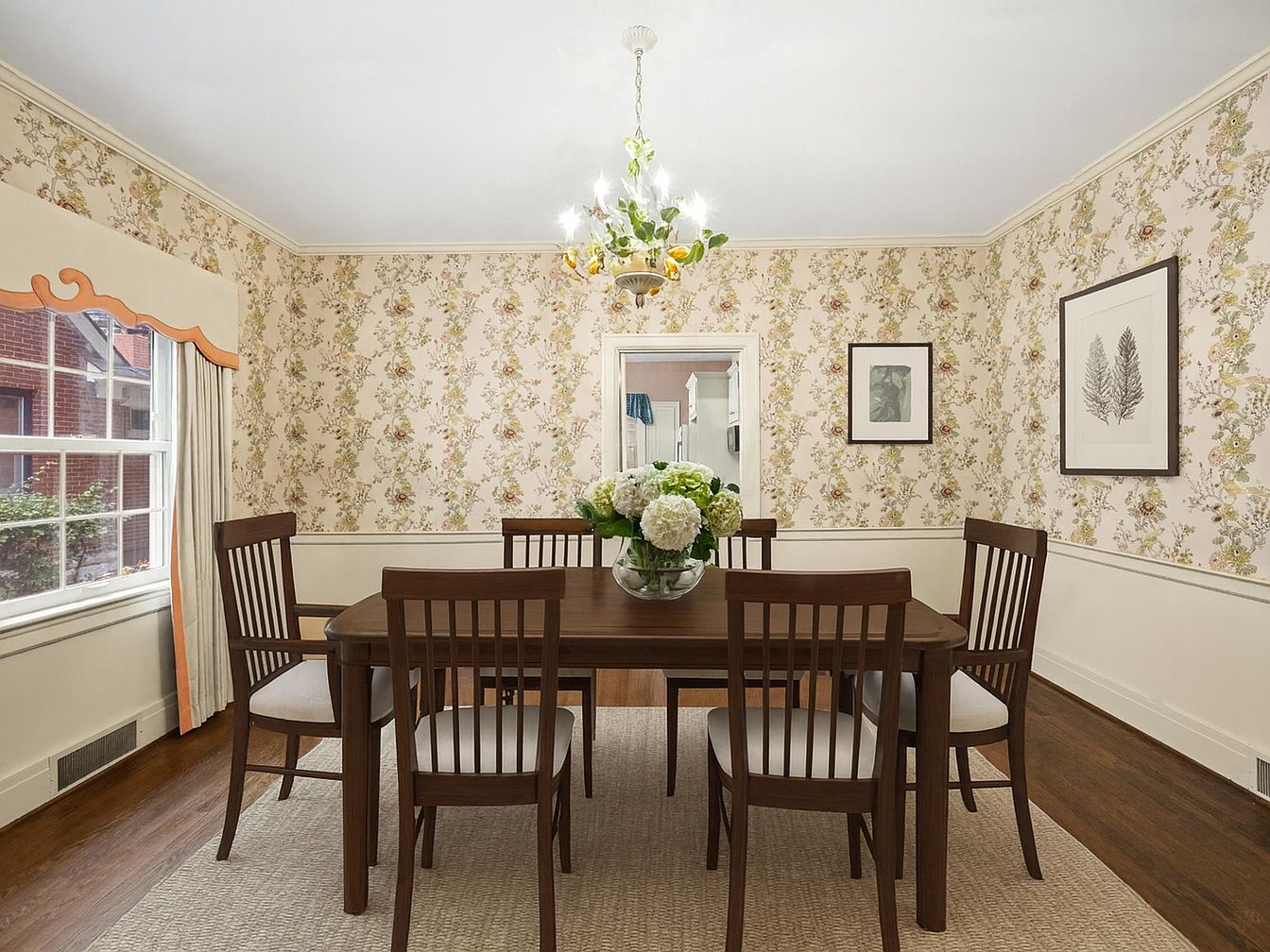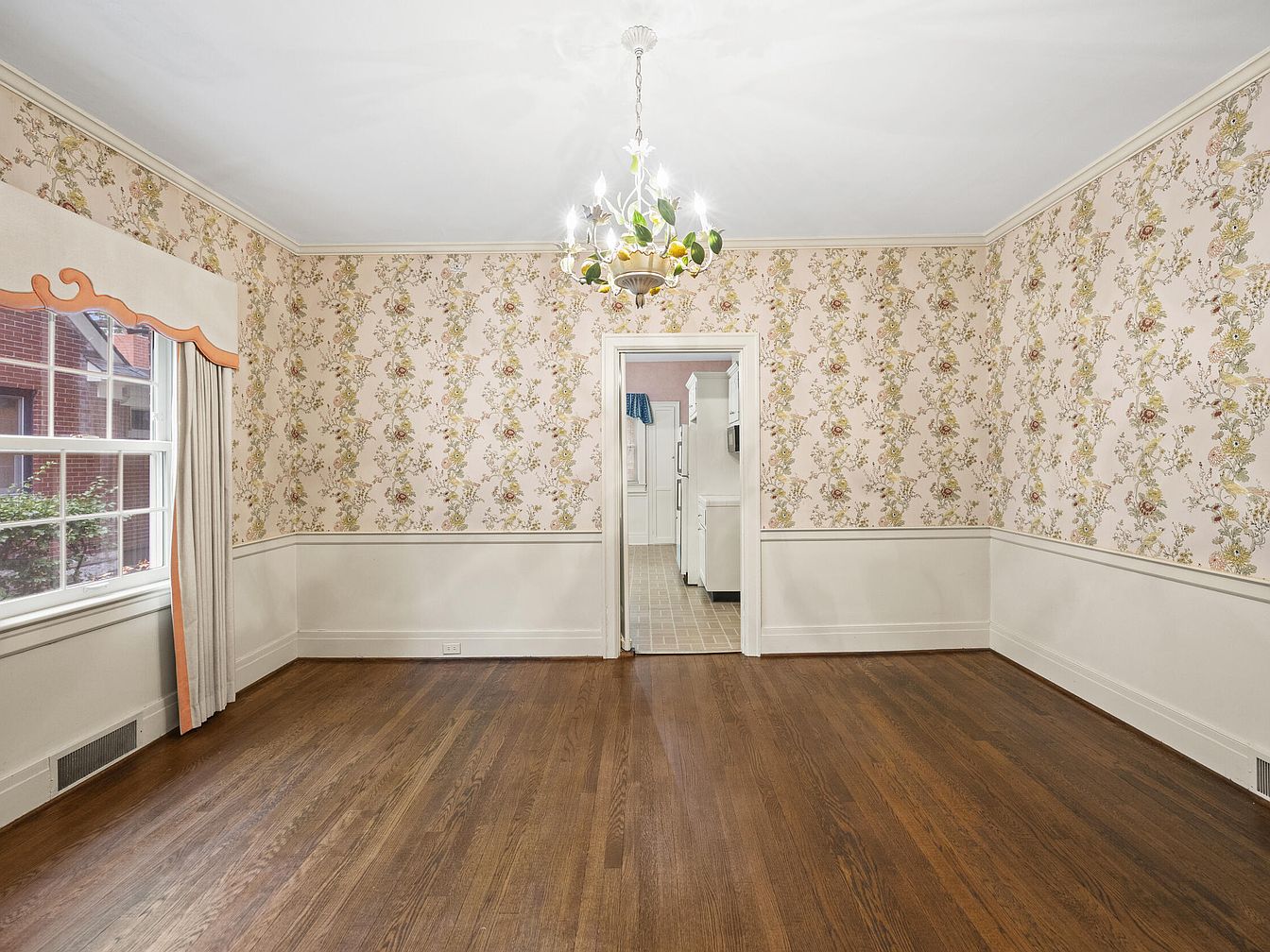 A spacious dining room with warm wooden floors stretches towards an entryway leading into a white, galley-style kitchen. The walls are decorated with vintage floral wallpaper, mostly in soft pinks, creams, and subtle greens, bordered by off-white wainscoting about mid-wall height. Crown molding lines the ceiling, enhancing the traditional aesthetic. A window to the left brings in daylight, framed by heavy, cream-colored drapes with a bold orange valance. Overhead, a whimsical chandelier of metal and foliage-shaped detail offers a soft glow, creating a cozy, elegant atmosphere ideal for gatherings.