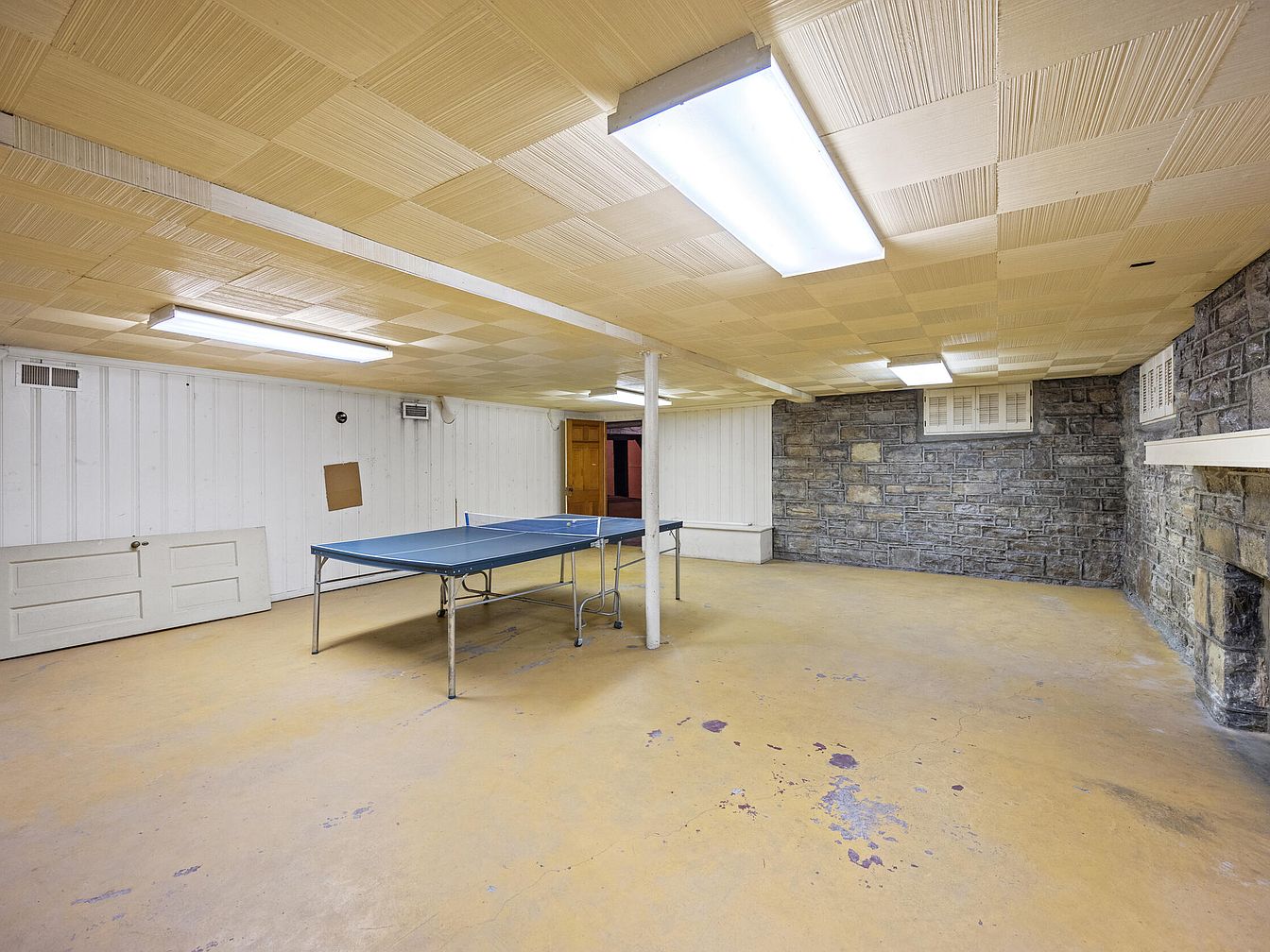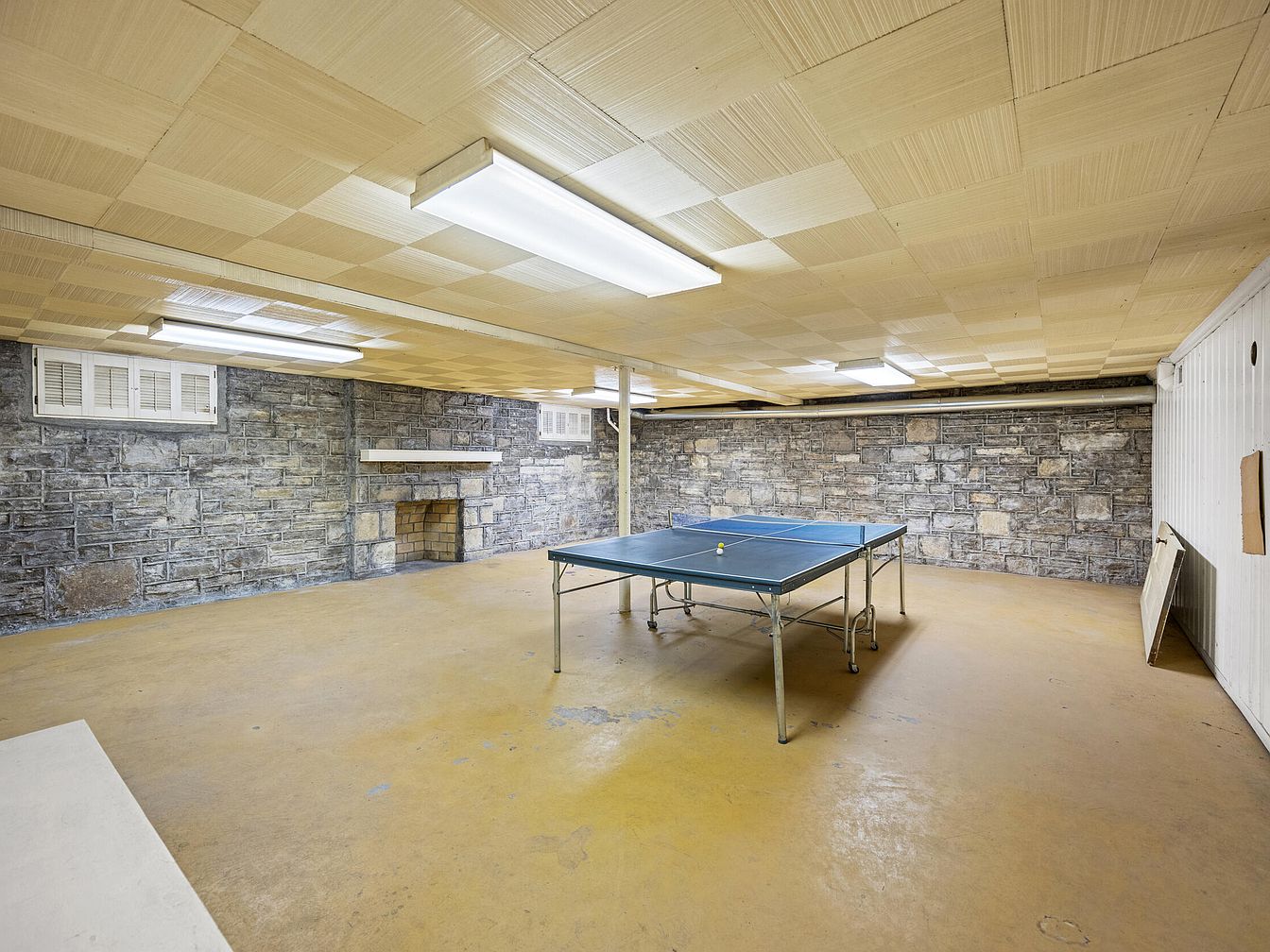 Large spacious basement with a mid-century aesthetic, featuring stone masonry walls of gray and tan tones, lending a rustic, historic feel to the space. The ceiling is covered in a checkerboard pattern of beige acoustic tiles, outfitted with fluorescent strip lighting for ample brightness. The floor is worn, painted concrete in a muted tan color. A vintage fireplace with a simple mantel on one wall adds historical character, flanked by small shuttered windows. At the center stands a blue table tennis setup, suggesting recreational use. Overall, the area feels utilitarian, cool, and minimalist, ideal for games and gatherings.
