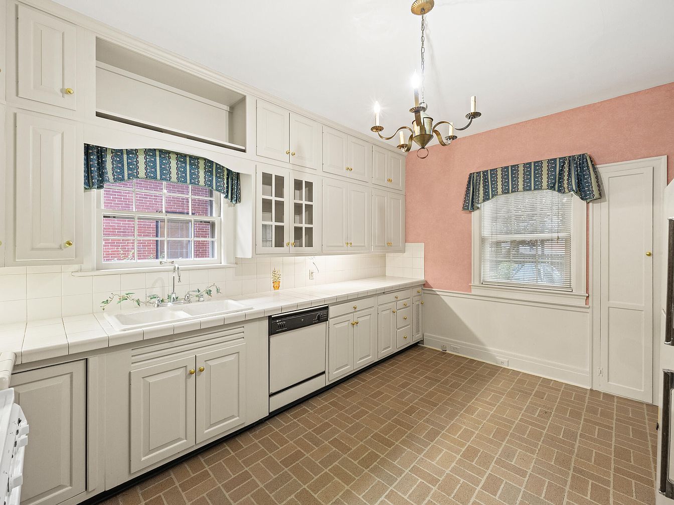 This spacious kitchen features a wall of cream-colored cabinetry with gold knobs, providing ample storage. A wide window over the double sink is dressed with a blue and green patterned valance, matching the valance on a smaller window to the right. The countertops and backsplash are covered in white tile, creating a clean and classic look. A brass chandelier with candle-style lights hangs from the ceiling, adding a subtle traditional touch. The floor has a tan and brown brick-patterned design, lending warmth to the space. Soft pink walls above white wainscoting balance the palette with a gentle, homely feel.