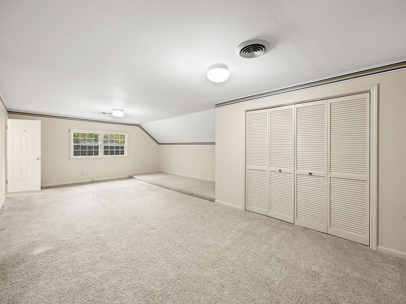 A spacious, carpeted room with off-white walls and a subtle striped border near the ceiling. The far wall features a set of three large windows, bringing in abundant natural light and framed by simple white molding. There’s a white door to the left and a pair of double closet doors with louvered panels on the right. The ceiling is gently sloped, suggesting this might be an upper floor or attic conversion. Two flush-mounted round light fixtures illuminate the area, and a small raised alcove extends from the main floor, perfect for a cozy seating or sleeping area.