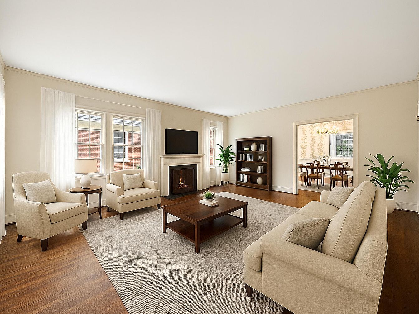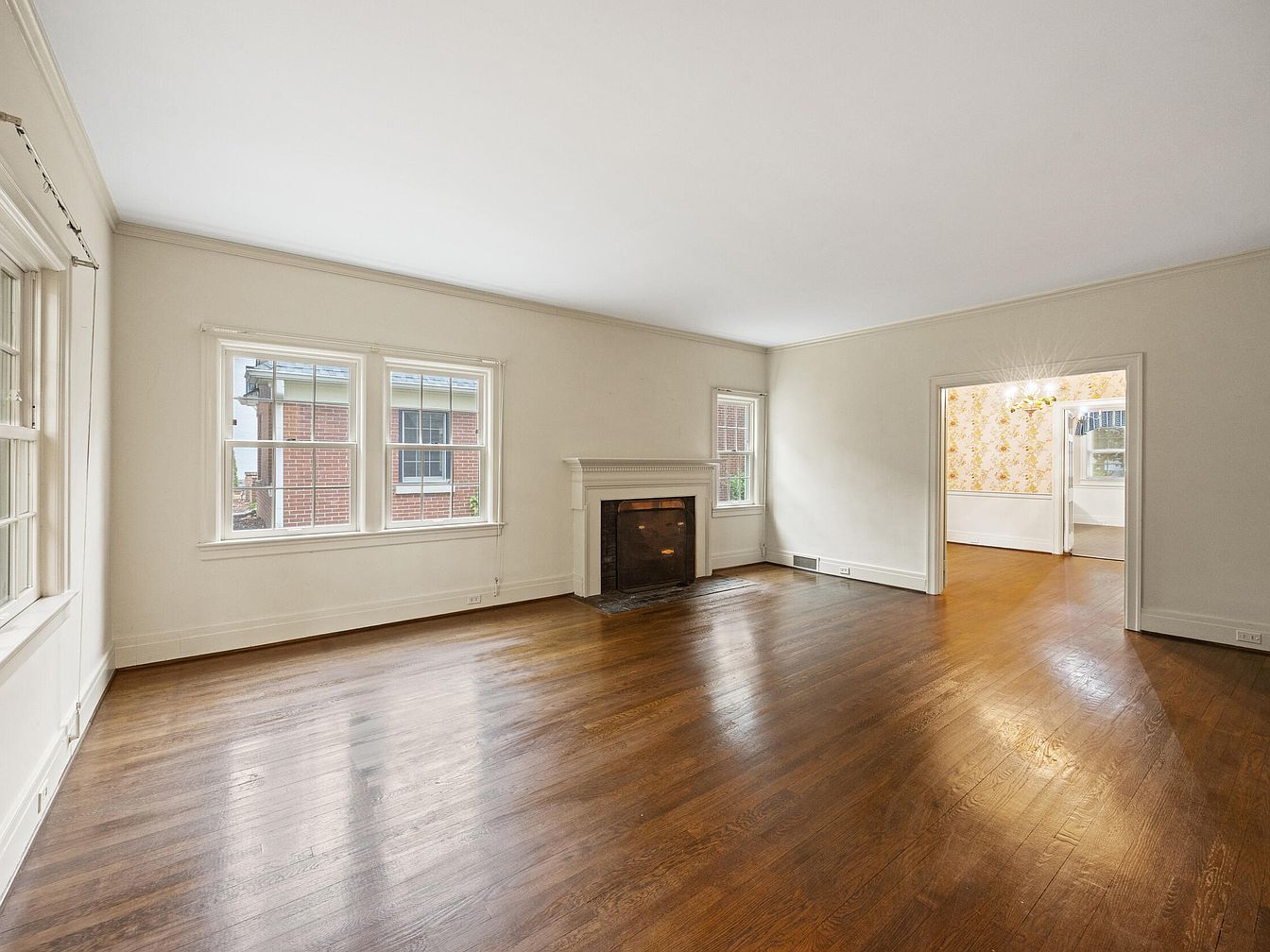 Spacious living room featuring rich, medium-tone hardwood floors that stretch across the open layout. Walls are painted a light, neutral color, creating a bright and airy atmosphere. Two large windows with white trim allow natural light to pour in, offering views of an adjacent brick structure outside. Centered against one wall is an elegant fireplace with a simple mantelpiece, adding a classic focal point to the room. An open doorway leads to another area with floral wallpaper and visible lighting, hinting at a formal dining room. The overall design blends historic charm with understated, traditional aesthetics.