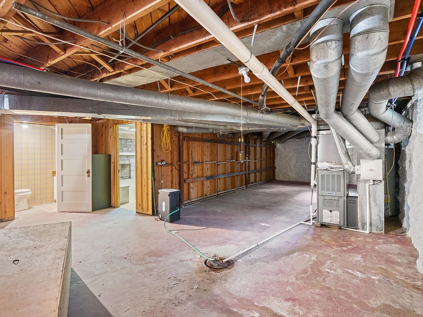 Large unfinished basement space with exposed wooden ceiling beams and visible HVAC ductwork running along the ceiling. The concrete floor shows some discoloration and worn areas. To the left, an open doorway reveals a small bathroom with a white toilet and yellow plaid wallpaper. The wood-paneled walls add a rustic aspect, while various pipes and yellow electrical cords hang from above. On the right, a gray furnace and utility equipment are set against a rough, painted stone wall, highlighting the mechanical aspect of the area. Overall, the space feels utilitarian with an industrial and practical aesthetic.