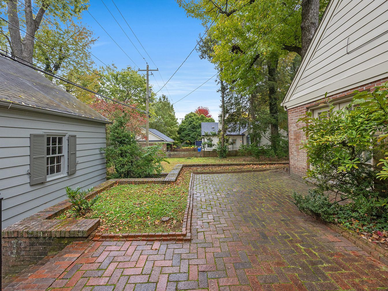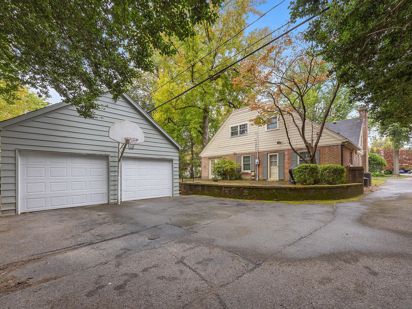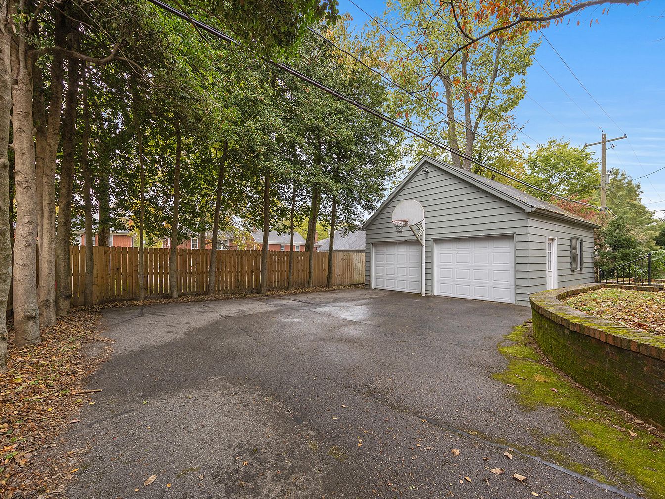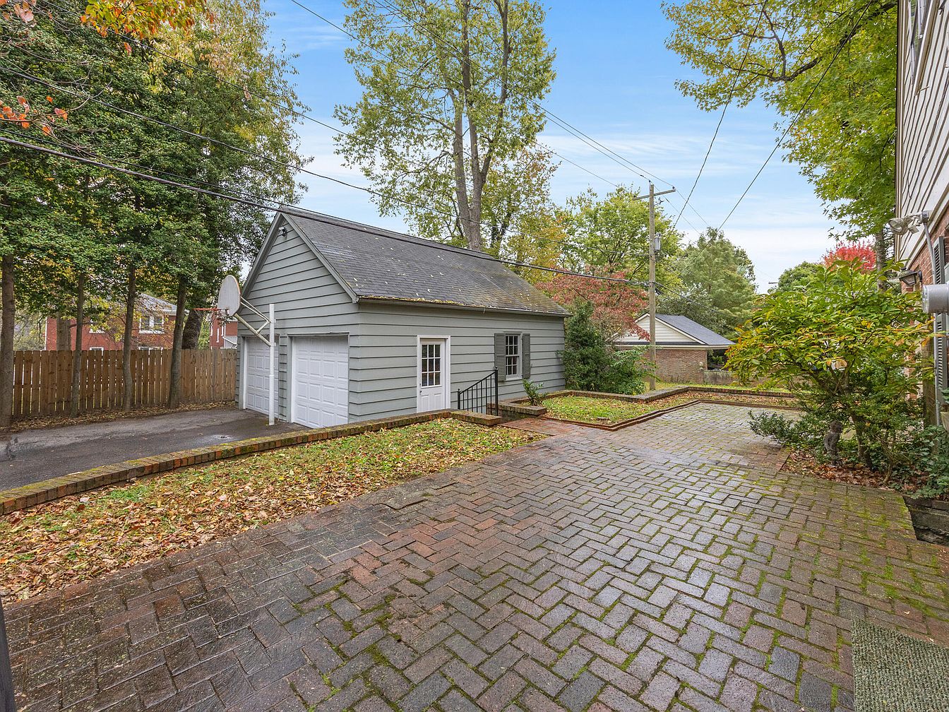 A spacious brick-paved driveway leads to a detached two-car garage painted in muted gray with classic white doors. The surrounding area is bordered by mature trees and a wooden privacy fence, offering a sense of seclusion. Low brick retaining walls outline gentle terraces covered with autumn leaves, adding rustic charm to the outdoor space. There is a small staircase with a metal railing connecting the grassy section to the garage entrance. The scene is tranquil, with subtle hints of seasonal color in the foliage and a clean, well-kept look to the property’s exterior.