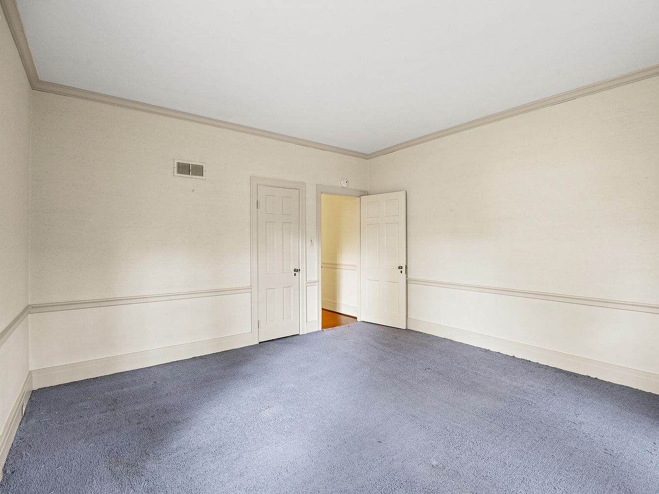 This room features an expansive layout with pale cream walls accented by a subtle chair rail and matching baseboards, creating a sense of quiet elegance. The floor is covered in plush, muted blue carpet that complements the neutral tones of the walls and trim. Two paneled doors are set on one wall: one is open, revealing a glimpse of a hallway with polished wood floors and soft yellow lighting, while the other remains closed. The ceiling is high and painted white, contributing to the room’s airy and spacious ambiance, ideal for flexible bedroom use or personal retreat.