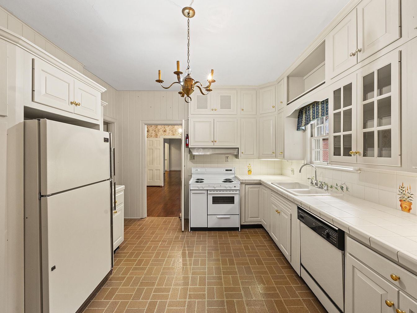 Spacious, vintage-inspired kitchen with an L-shaped layout framed by cream-colored cabinetry and brass hardware. The countertops are white tile, matching the tile backsplash above the stove and sink. A window above the sink is adorned with a blue-patterned valance, letting in ample natural light. The stove, refrigerator, and dishwasher are all in white, harmonizing with the cabinetry. A mid-century brass chandelier hangs from the ceiling, adding a touch of formality. The flooring is a tan, brick-patterned vinyl or linoleum, contrasting with the lighter tones throughout the room. The overall aesthetic is warm, bright, and inviting.