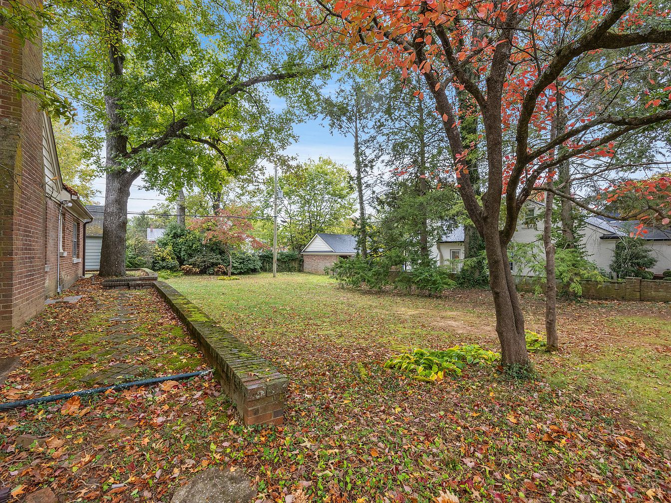 This spacious backyard features a gently sloping lawn bordered by mature trees, with autumn leaves scattered across the ground. To the left stands a traditional brick exterior wall of the house, while a low brick retaining wall runs along the edge of a stone pathway. The color palette consists of earthy browns and greens, enhanced by the vibrant red and orange leaves still clinging to branches. In the background, shrubs and greenery provide a sense of privacy, and distant outbuildings peek through the trees, emphasizing the yard’s tranquil, established feel and historical aesthetic.