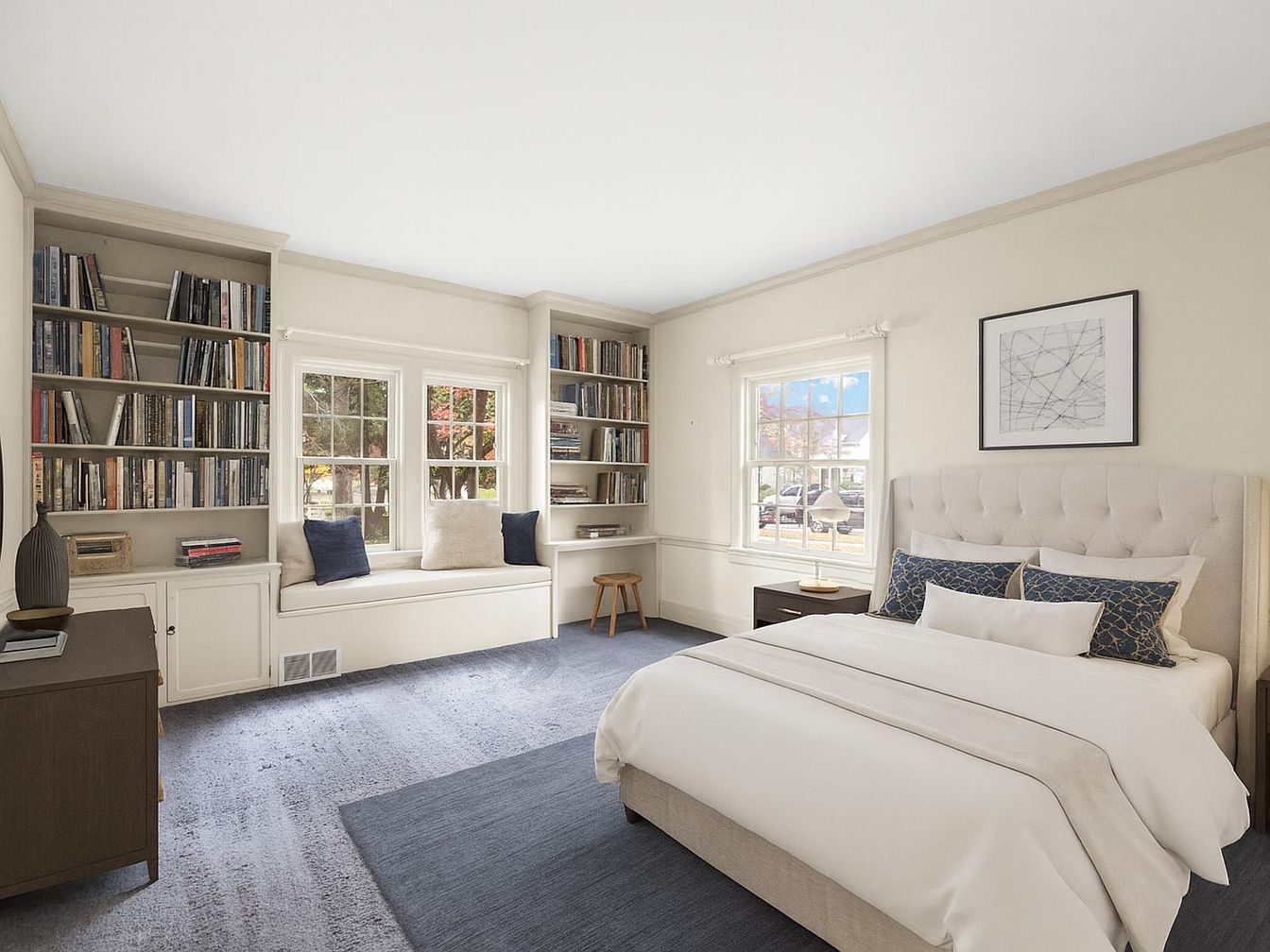 A spacious bedroom featuring a relaxing window nook flanked by built-in bookshelves that line the entire wall. The room’s color palette is soft and neutral, with creamy white walls and trim, and plush gray-blue carpeting. A large upholstered bed with white and navy bedding is positioned to the right, accompanied by two simple nightstands. Natural light streams through two windows, illuminating the cozy nook adorned with plush cushions. Minimalist decor includes abstract wall art, a small wooden stool by the shelving, and subtle decorative items, creating a tranquil, inviting, and well-organized retreat that blends comfort with practical elegance.
