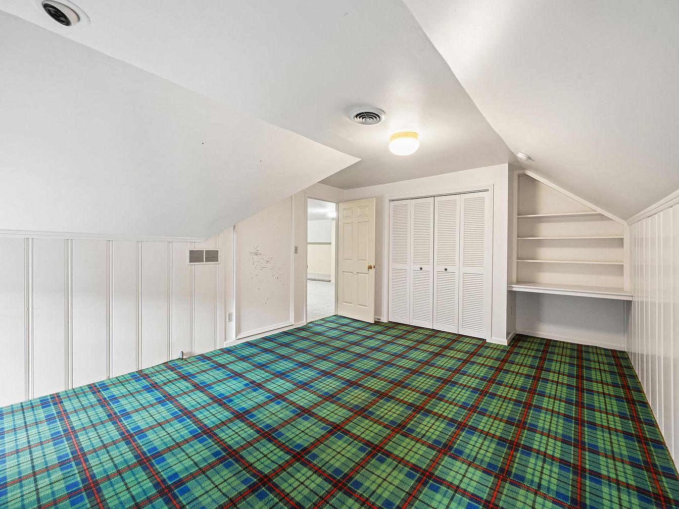 A cozy space with sloped ceilings, likely part of an attic or upper-level bonus room, featuring striking green and blue plaid carpet accented with red lines. The walls are painted a clean white and display vertical panel detailing on the lower half. Built-in open shelves and a desk nook are tucked into one corner beneath a sharply angled ceiling, maximizing storage. A set of white double closet doors provides additional storage. Soft lighting is provided by a flush-mount ceiling fixture. The subtle play between traditional and retro aesthetics is anchored by the bold, patterned carpet.