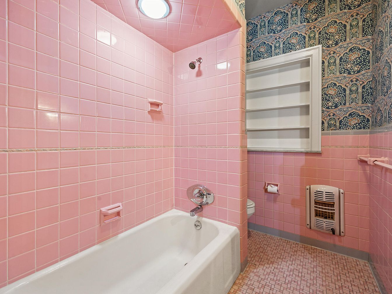 A vintage bathroom features a shower and bathtub area lined with glossy, pastel pink square tiles that continue across the walls and ceiling, creating a cohesive retro look. The floor is finished in mosaic tiles blending shades of pink and cream, enhancing the nostalgic feel. A built-in shelf is set into the far wall above the toilet paper holder, painted white for contrast. One wall is adorned with intricate blue and white wallpaper with an ornate floral motif, adding texture and classic charm. Additional elements include a built-in wall heater and pink grab bars, further emphasizing the room’s mid-century aesthetic.